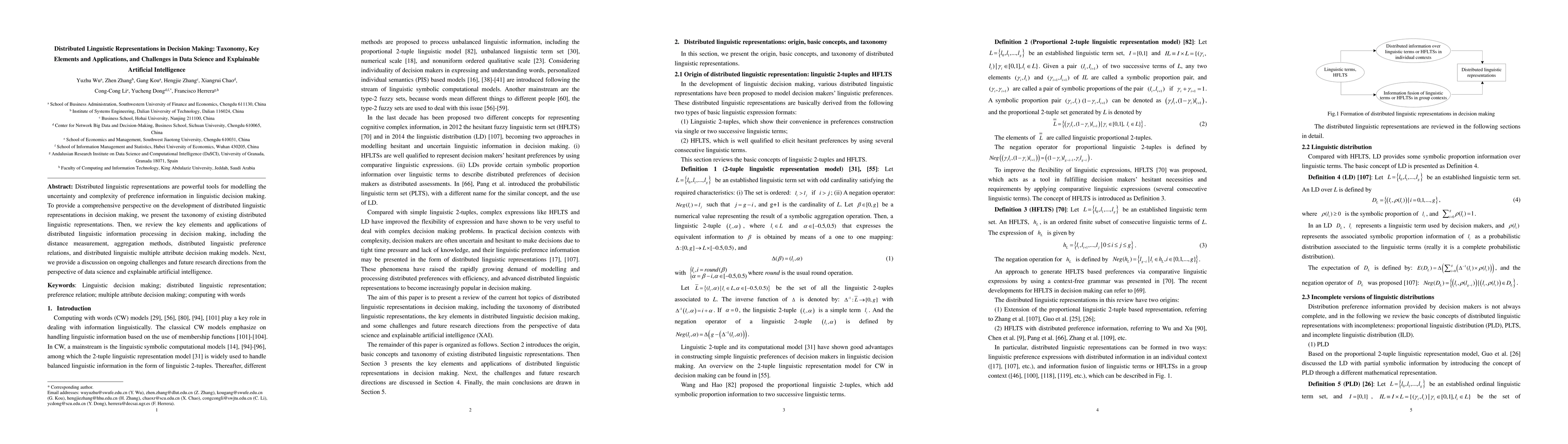 This paper categorizes distributed linguistic representations in decision making, reviewing key elements like distance measurement and aggregation methods. It also discusses challenges and future research directions in data science and explainable AI.