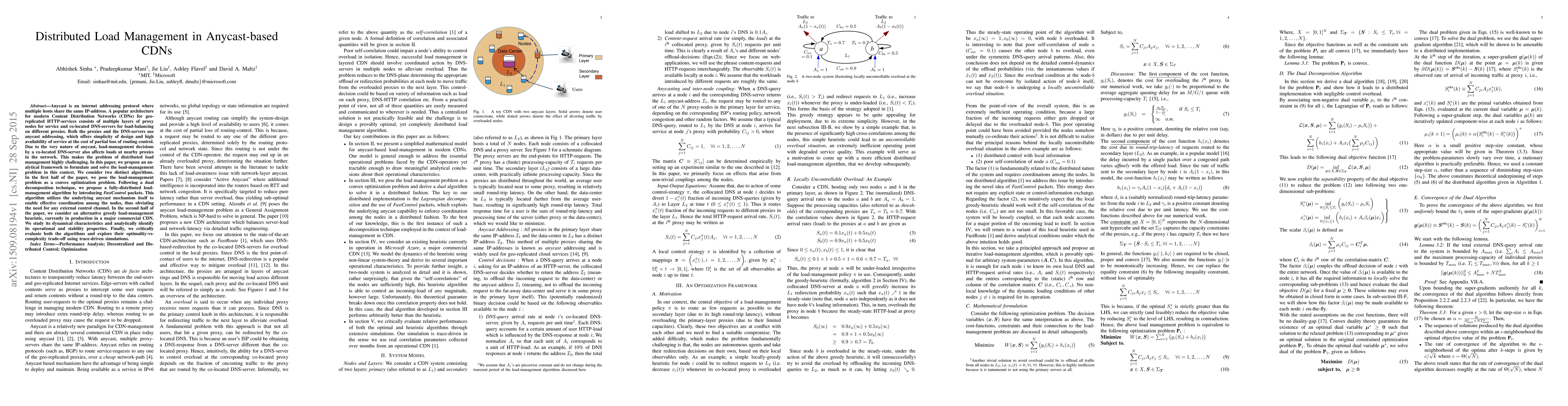 This paper proposes an analytical framework for distributed load management in anycast-based CDNs, introducing a fully-distributed optimization algorithm using FastControl packets and evaluating it against a heuristic approach used in commercial CDNs, analyzing their trade-offs in optimality and complexity.