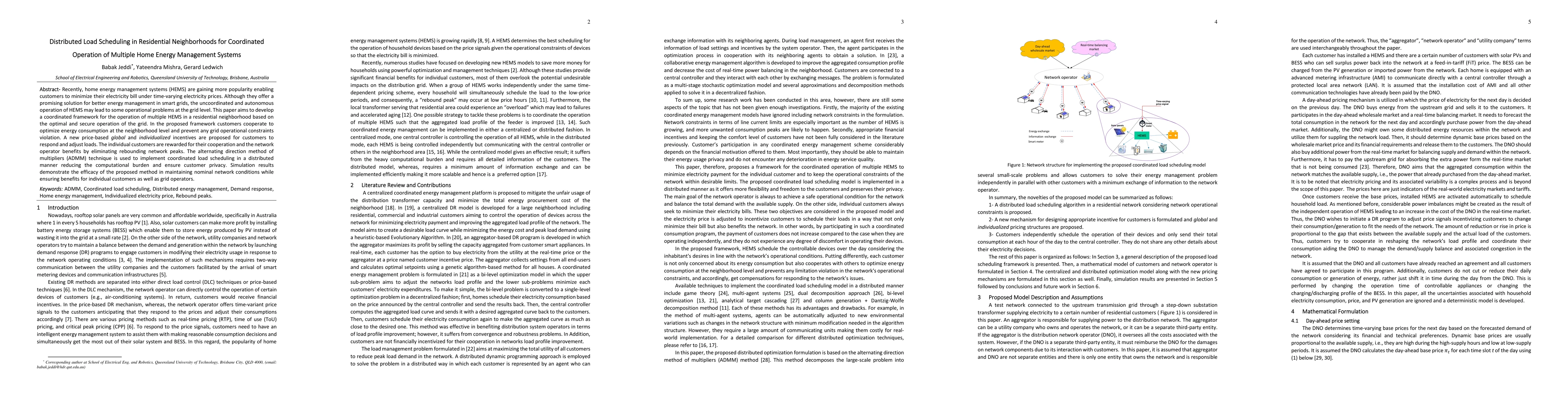 This paper proposes a coordinated framework for multiple home energy management systems in residential neighborhoods to optimize grid operation and minimize electricity bills. The framework uses distributed load scheduling with global and individualized incentives, implemented via the ADMM technique, to ensure grid stability and customer benefits.