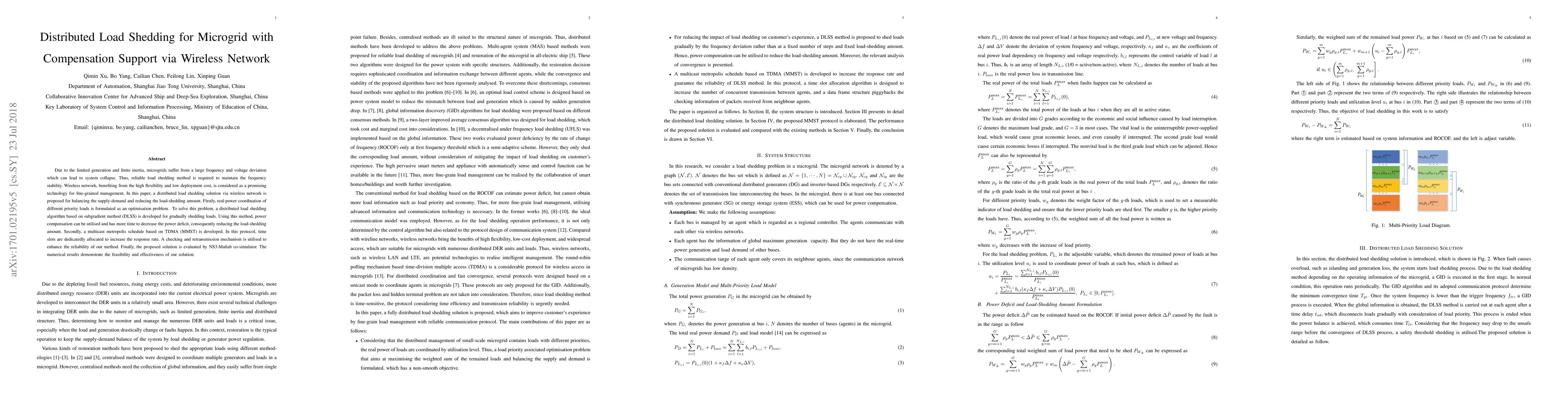This paper proposes a distributed load shedding solution for microgrids using a wireless network to manage frequency stability. It introduces a distributed load shedding algorithm (DLSS) based on the subgradient method and a multicast metropolis schedule (MMST) to enhance response rates and reliability, evaluated through NS3-Matlab co-simulation, showing its feasibility and effectiveness.