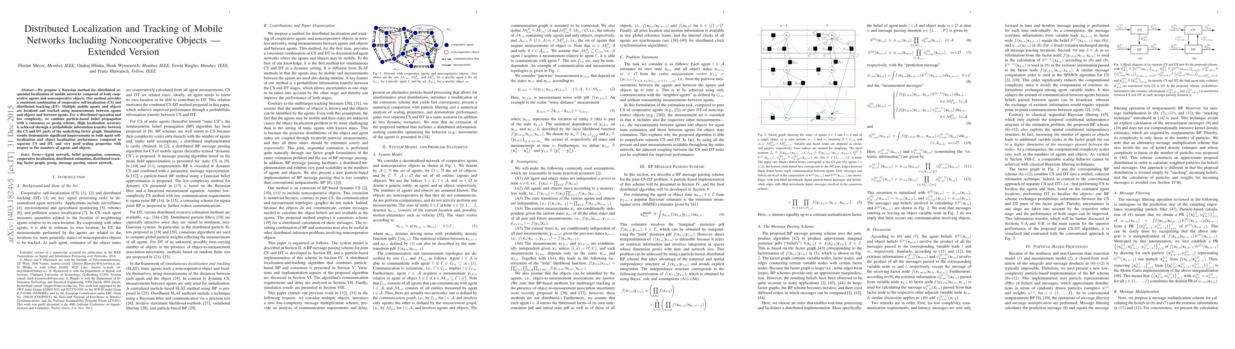 We propose a Bayesian method for distributed sequential localization of mobile networks composed of both cooperative agents and noncooperative objects. Our method provides a consistent combination of cooperative self-localization (CS) and distributed tracking (DT). Multiple mobile agents and objects are localized and tracked using measurements between agents and objects and between agents. For a distributed operation and low complexity, we combine particle-based belief propagation with a consensus or gossip scheme. High localization accuracy is achieved through a probabilistic information transfer between the CS and DT parts of the underlying factor graph. Simulation results demonstrate significant improvements in both agent self-localization and object localization performance compared to separate CS and DT, and very good scaling properties with respect to the numbers of agents and objects.