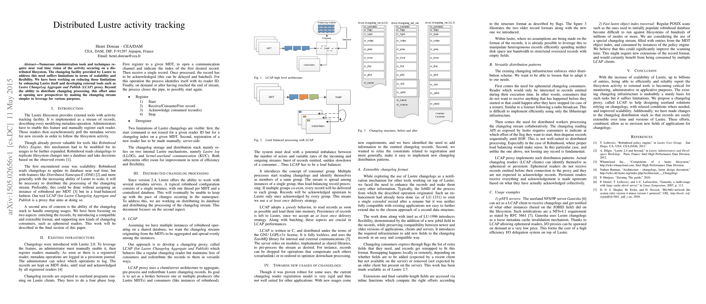 This paper discusses enhancements to the Lustre filesystem's changelog facility to improve scalability and flexibility for real-time activity tracking. It introduces the Lustre ChangeLog Aggregate and Publish (LCAP) proxy to distribute changelog processing and simplify its use for various administrative purposes.