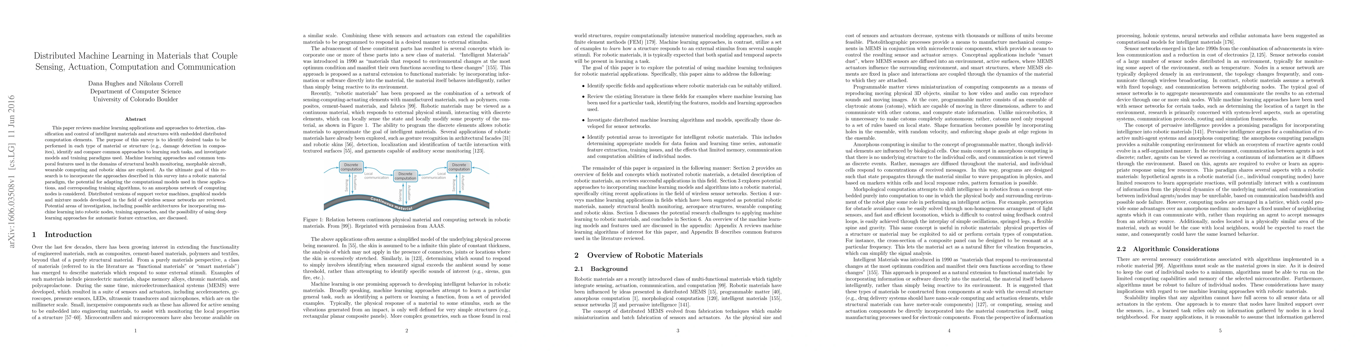 This paper surveys machine learning applications in intelligent materials, focusing on detection, classification, and control tasks. It explores distributed computation models and training paradigms for structural health monitoring and other domains, considering their adaptation to robotic material paradigms.