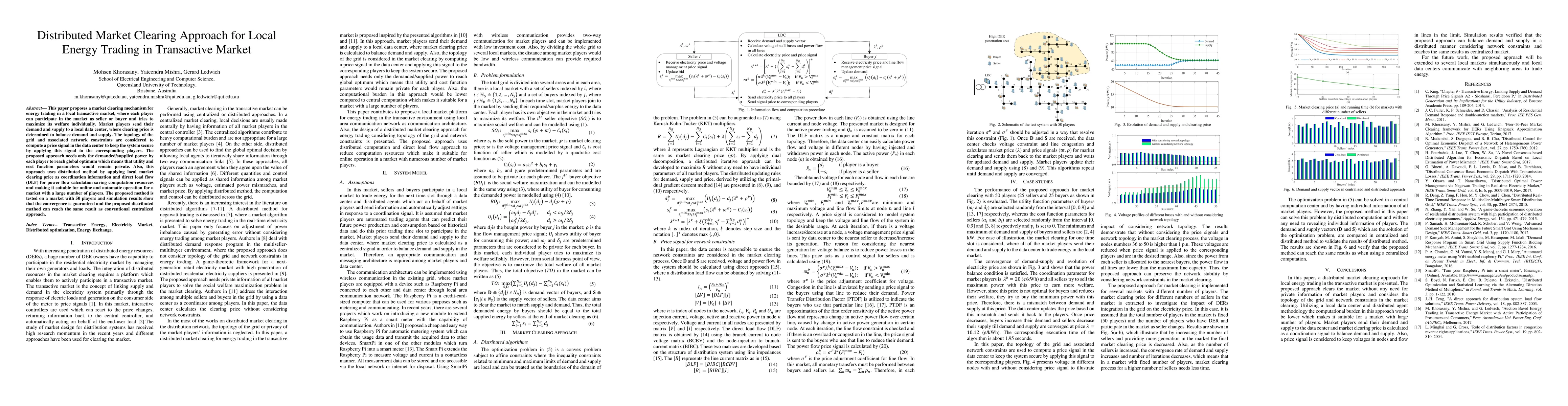 This paper proposes a market clearing mechanism for energy trading in a local transactive market, where each player can participate in the market as seller or buyer and tries to maximize its welfare individually. Market players send their demand and supply to a local data center, where clearing price is determined to balance demand and supply. The topology of the grid and associated network constraints are considered to compute a price signal in the data center to keep the system secure by applying this signal to the corresponding players. The proposed approach needs only the demanded/supplied power by each player to reach global optimum which means that utility and cost function parameters would remain private. Also, this approach uses distributed method by applying local market clearing price as coordination information and direct load flow (DLF) for power flow calculation saving computation resources and making it suitable for online and automatic operation for a market with a large number of players. The proposed method is tested on a market with 50 players and simulation results show that the convergence is guaranteed and the proposed distributed method can reach the same result as conventional centralized approach.