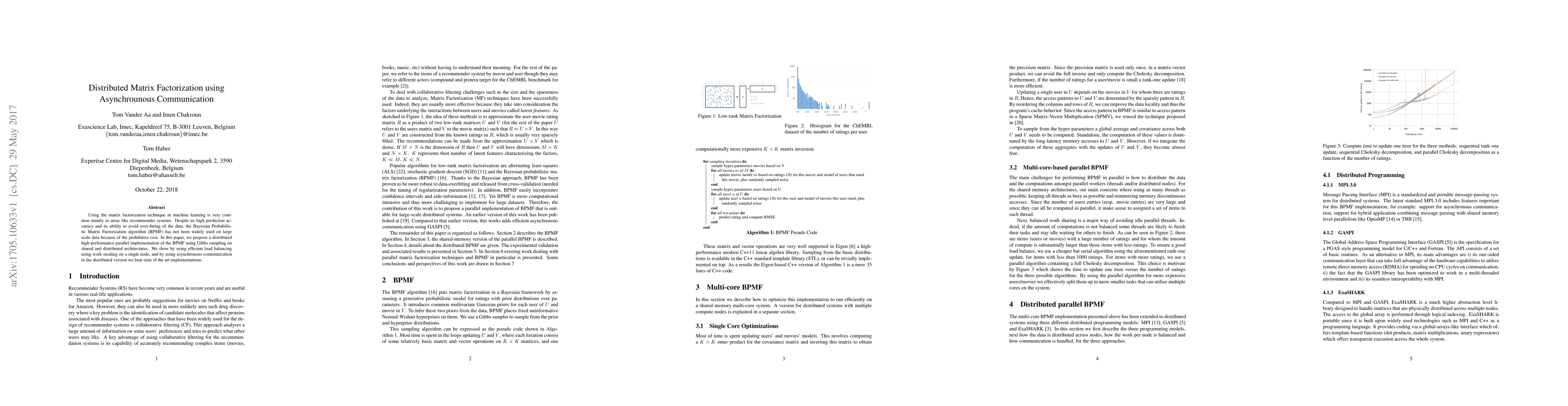 This paper proposes a distributed, high-performance parallel implementation of Bayesian Probabilistic Matrix Factorization (BPMF) using asynchronous communication and Gibbs sampling. The approach achieves better performance than state-of-the-art methods through efficient load balancing and asynchronous communication.