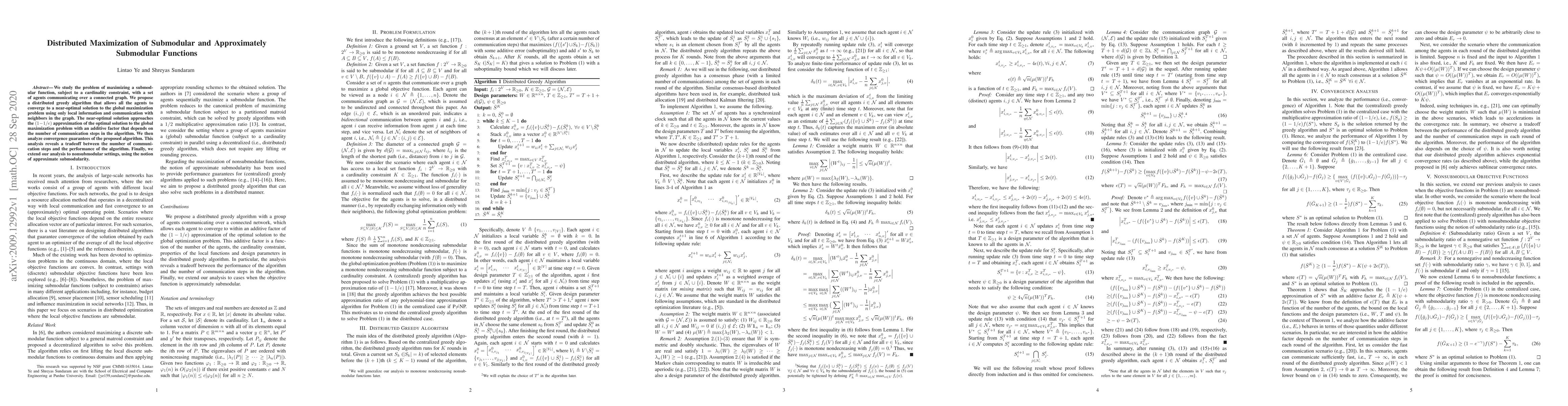 This paper proposes a distributed greedy algorithm for maximizing submodular functions over a network of agents, achieving near-optimal solutions with local communication. The algorithm converges to an approximation of the global optimum, balancing communication steps with performance.