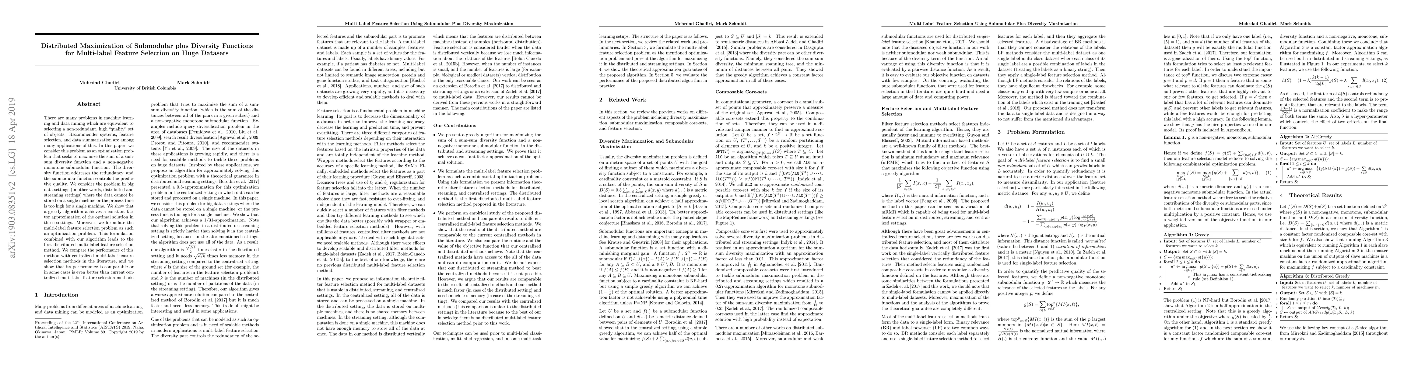 There are many problems in machine learning and data mining which are equivalent to selecting a non-redundant, high "quality" set of objects. Recommender systems, feature selection, and data summarization are among many applications of this. In this paper, we consider this problem as an optimization problem that seeks to maximize the sum of a sum-sum diversity function and a non-negative monotone submodular function. The diversity function addresses the redundancy, and the submodular function controls the predictive quality. We consider the problem in big data settings (in other words, distributed and streaming settings) where the data cannot be stored on a single machine or the process time is too high for a single machine. We show that a greedy algorithm achieves a constant factor approximation of the optimal solution in these settings. Moreover, we formulate the multi-label feature selection problem as such an optimization problem. This formulation combined with our algorithm leads to the first distributed multi-label feature selection method. We compare the performance of this method with centralized multi-label feature selection methods in the literature, and we show that its performance is comparable or in some cases is even better than current centralized multi-label feature selection methods.