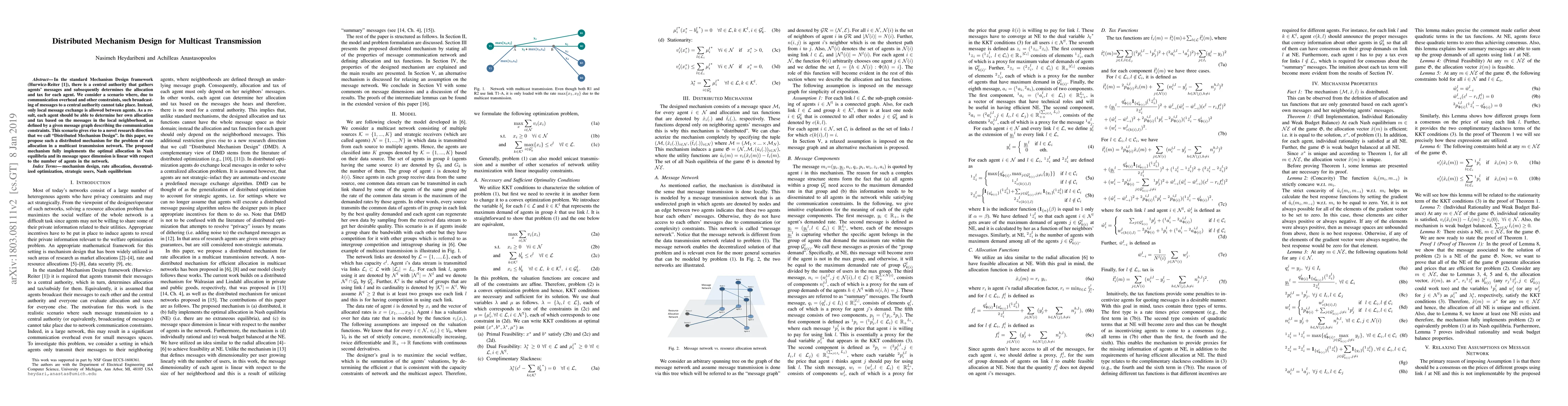 This paper introduces "Distributed Mechanism Design" for multicast transmission networks, where local message exchange replaces centralized communication. It proposes a distributed mechanism that achieves optimal rate allocation in Nash equilibria, with a message space dimension linearly proportional to the number of agents.