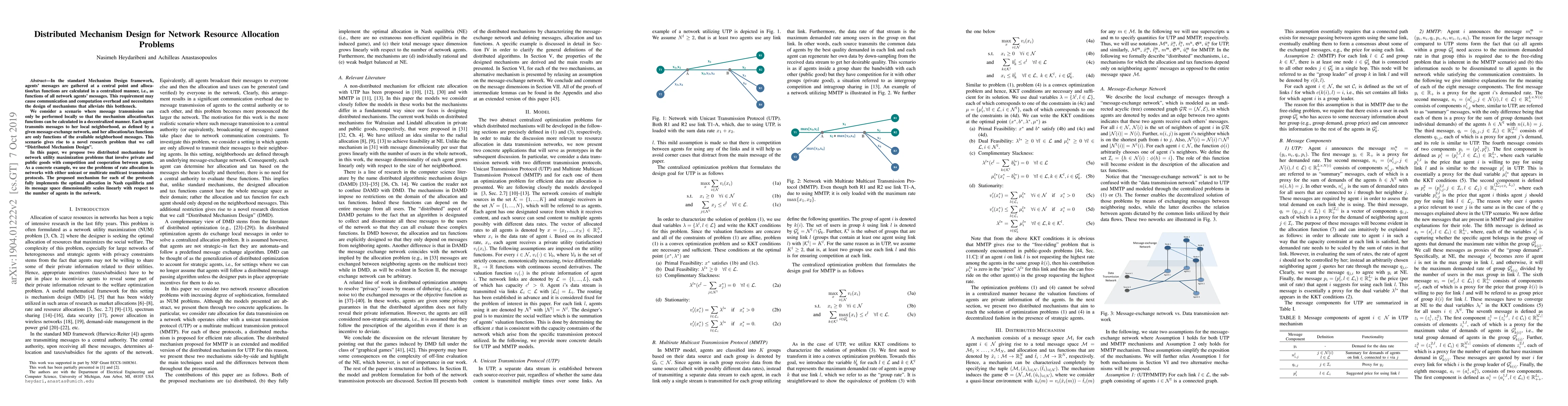In the standard Mechanism Design framework, agents' messages are gathered at a central point and allocation/tax functions are calculated in a centralized manner, i.e., as functions of all network agents' messages. This requirement may cause communication and computation overhead and necessitates the design of mechanisms that alleviate this bottleneck. We consider a scenario where message transmission can only be performed locally so that the mechanism allocation/tax functions can be calculated in a decentralized manner. Each agent transmits messages to her local neighborhood, as defined by a given message-exchange network, and her allocation/tax functions are only functions of the available neighborhood messages. This scenario gives rise to a novel research problem that we call "Distributed Mechanism Design". In this paper, we propose two distributed mechanisms for network utility maximization problems that involve private and public goods with competition and cooperation between agents. As a concrete example, we use the problems of rate allocation in networks with either unicast or multirate multicast transmission protocols. The proposed mechanism for each of the protocols fully implements the optimal allocation in Nash equilibria and its message space dimensionality scales linearly with respect to the number of agents in the network.