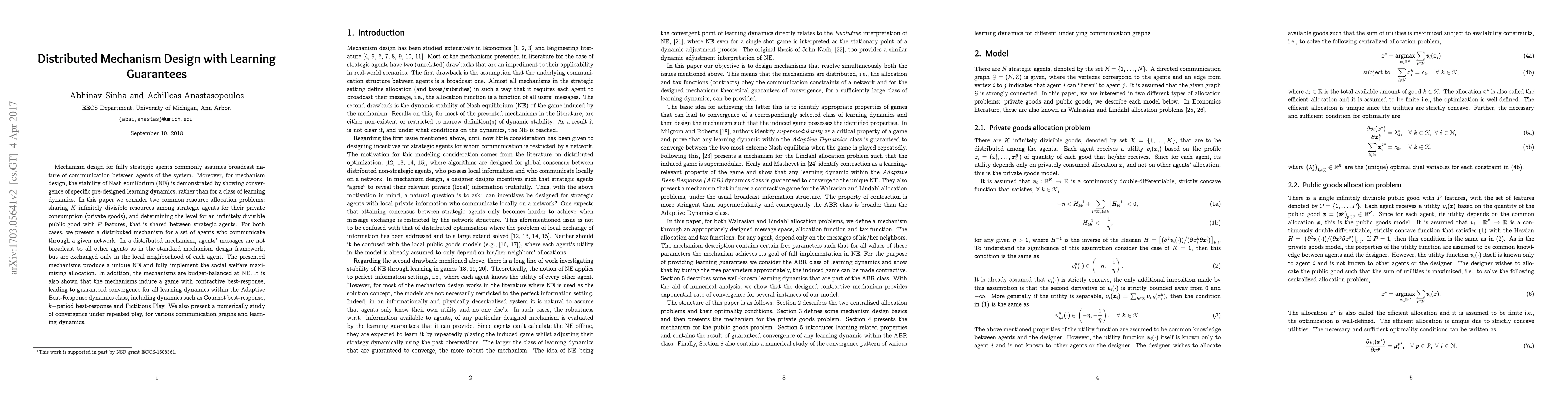 The paper presents a distributed mechanism design for resource allocation problems involving strategic agents communicating through a network, ensuring unique NE, social welfare maximization, and budget balance.