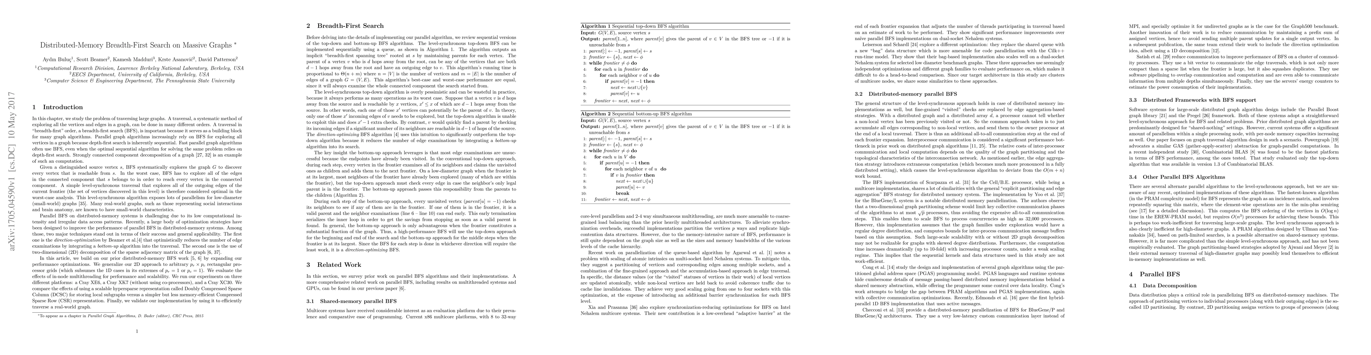This research paper explores efficient algorithms for traversing large graphs on distributed-memory supercomputers, including performance trade-offs between traditional and direction-optimizing breadth-first search algorithms.
