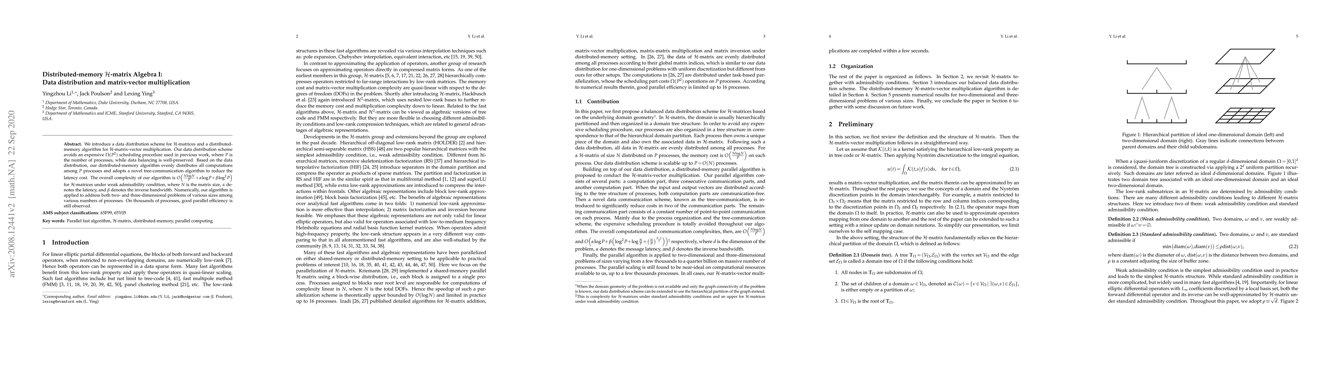 We introduce a data distribution scheme for $\mathcal{H}$-matrices and a distributed-memory algorithm for $\mathcal{H}$-matrix-vector multiplication. Our data distribution scheme avoids an expensive $\Omega(P^2)$ scheduling procedure used in previous work, where $P$ is the number of processes, while data balancing is well-preserved. Based on the data distribution, our distributed-memory algorithm evenly distributes all computations among $P$ processes and adopts a novel tree-communication algorithm to reduce the latency cost. The overall complexity of our algorithm is $O\Big(\frac{N \log N}{P} + \alpha \log P + \beta \log^2 P \Big)$ for $\mathcal{H}$-matrices under weak admissibility condition, where $N$ is the matrix size, $\alpha$ denotes the latency, and $\beta$ denotes the inverse bandwidth. Numerically, our algorithm is applied to address both two- and three-dimensional problems of various sizes among various numbers of processes. On thousands of processes, good parallel efficiency is still observed.