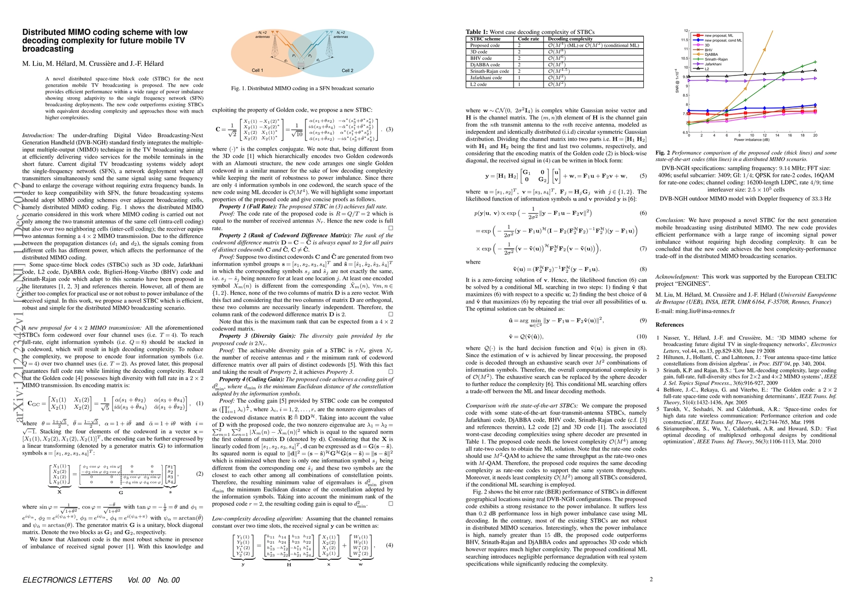 Summary: This paper proposes a novel distributed space-time block code for future mobile TV broadcasting, demonstrating efficient performance under power imbalance and outperforming existing codes with lower decoding complexity. The new code adapts well to single frequency network deployments.