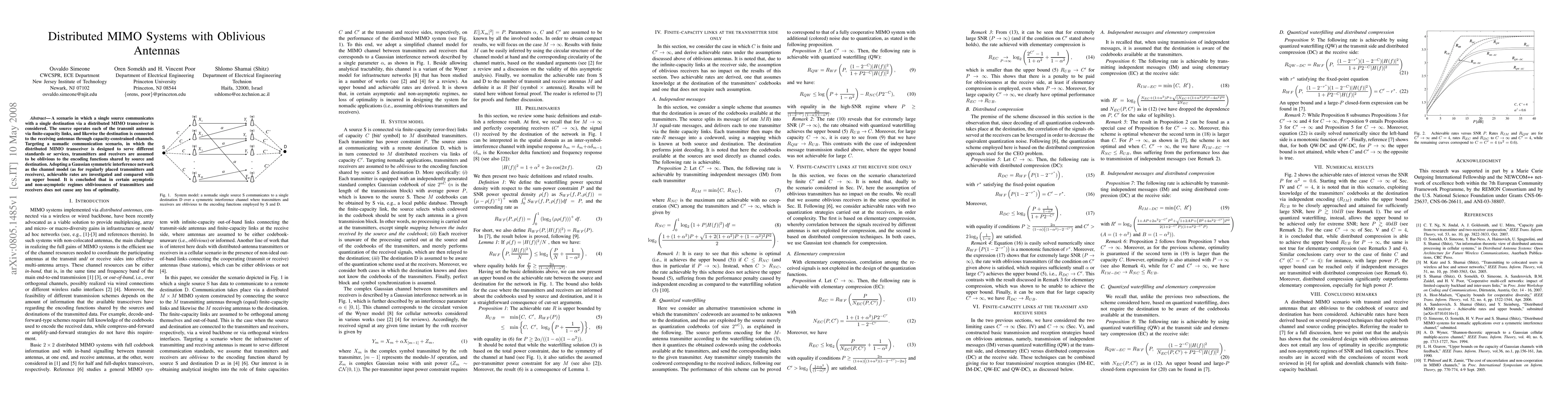 A scenario in which a single source communicates with a single destination via a distributed MIMO transceiver is considered. The source operates each of the transmit antennas via finite-capacity links, and likewise the destination is connected to the receiving antennas through capacity-constrained channels. Targeting a nomadic communication scenario, in which the distributed MIMO transceiver is designed to serve different standards or services, transmitters and receivers are assumed to be oblivious to the encoding functions shared by source and destination. Adopting a Gaussian symmetric interference network as the channel model (as for regularly placed transmitters and receivers), achievable rates are investigated and compared with an upper bound. It is concluded that in certain asymptotic and non-asymptotic regimes obliviousness of transmitters and receivers does not cause any loss of optimality.