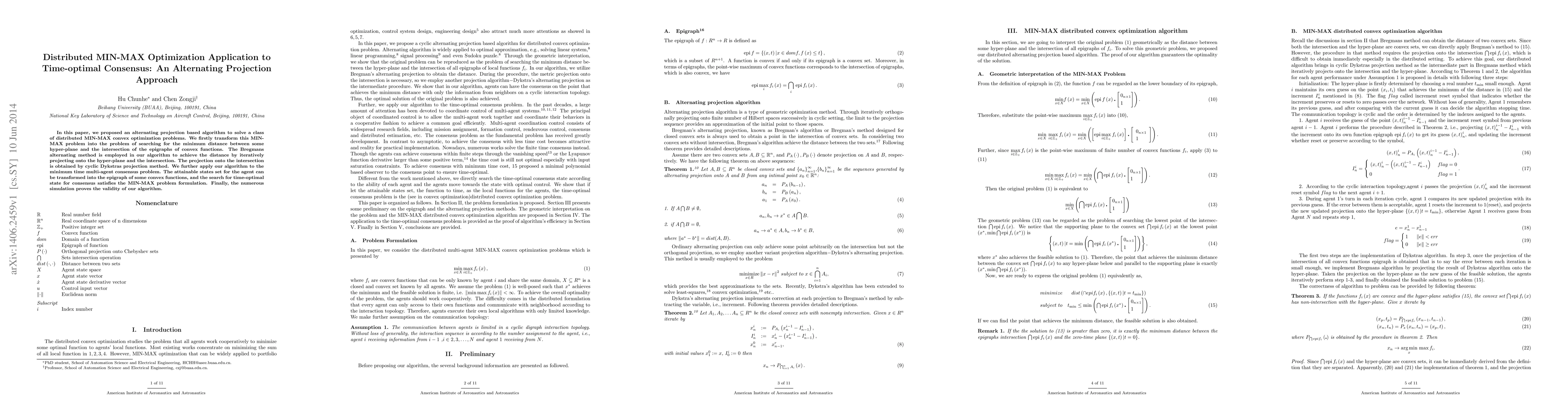 In this paper, we proposed an alternating projection based algorithm to solve a class of distributed MIN-MAX convex optimization problems. We firstly transform this MINMAX problem into the problem of searching for the minimum distance between some hyper-plane and the intersection of the epigraphs of convex functions. The Bregman's alternating method is employed in our algorithm to achieve the distance by iteratively projecting onto the hyper-plane and the intersection. The projection onto the intersection is obtained by cyclic Dykstra's projection method. We further apply our algorithm to the minimum time multi-agent consensus problem. The attainable states set for the agent can be transformed into the epigraph of some convex functions, and the search for time-optimal state for consensus satisfies the MIN-MAX problem formulation. Finally, the numerous simulation proves the validity of our algorithm.