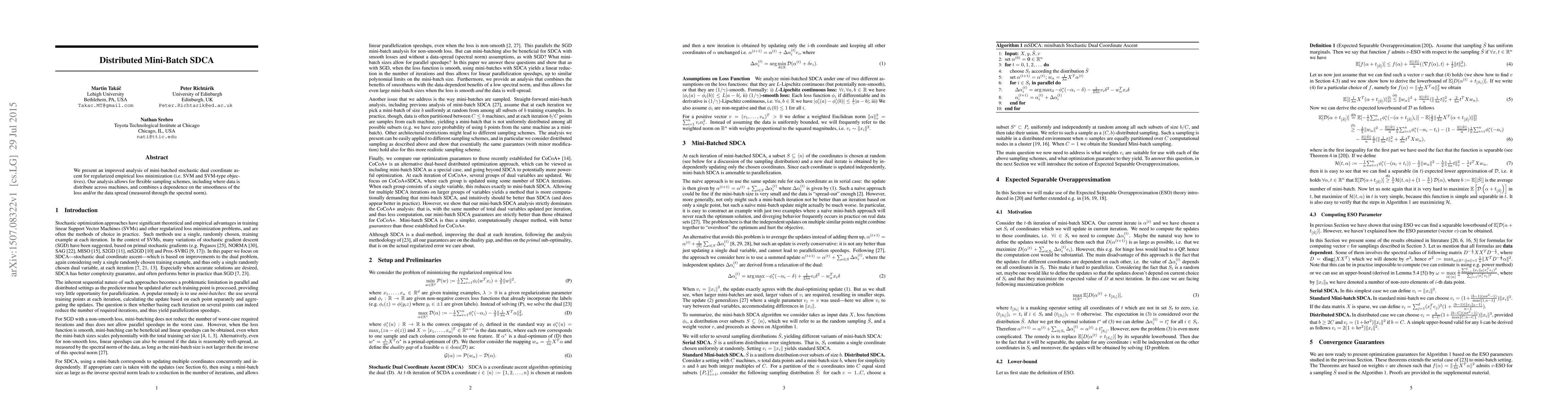 We present an improved analysis of mini-batched stochastic dual coordinate ascent for regularized empirical loss minimization (i.e. SVM and SVM-type objectives). Our analysis allows for flexible sampling schemes, including where data is distribute across machines, and combines a dependence on the smoothness of the loss and/or the data spread (measured through the spectral norm).