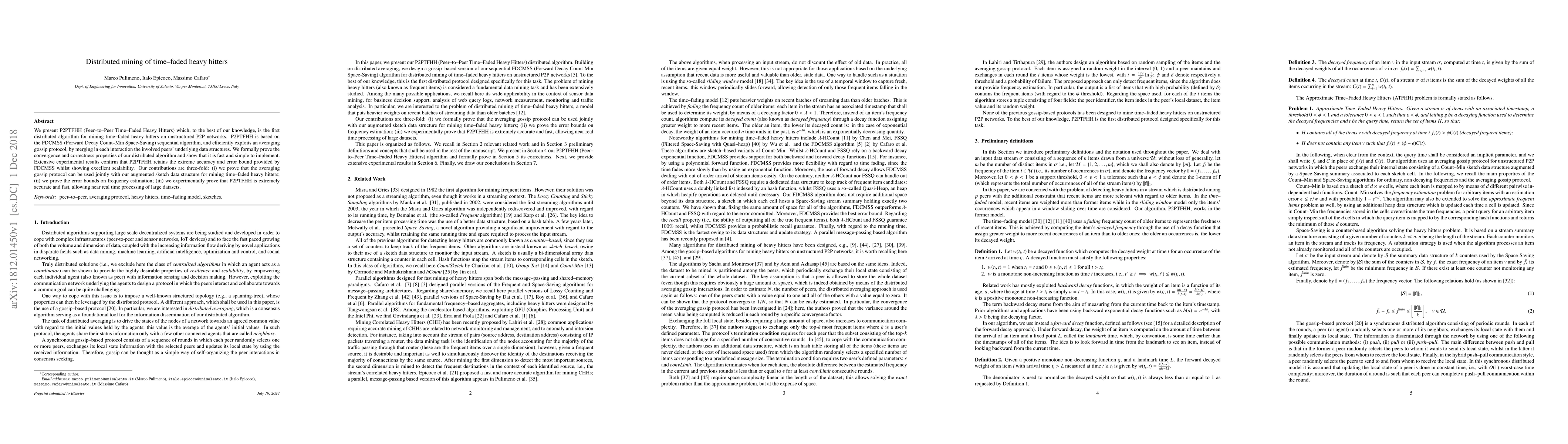 The paper presents P2PTFHH, a distributed algorithm for mining time-faded heavy hitters on unstructured P2P networks, based on the FDCMSS sequential algorithm and an averaging gossip protocol.