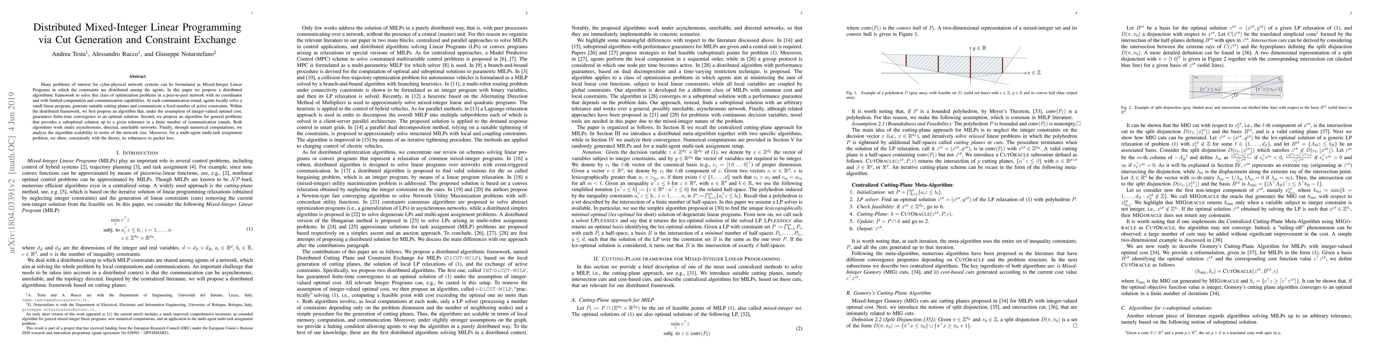 Many problems of interest for cyber-physical network systems can be formulated as Mixed-Integer Linear Programs in which the constraints are distributed among the agents. In this paper we propose a distributed algorithmic framework to solve this class of optimization problems in a peer-to-peer network with no coordinator and with limited computation and communication capabilities. At each communication round, agents locally solve a small linear program, generate suitable cutting planes and communicate a fixed number of active constraints. Within the distributed framework, we first propose an algorithm that, under the assumption of integer-valued optimal cost, guarantees finite-time convergence to an optimal solution. Second, we propose an algorithm for general problems that provides a suboptimal solution up to a given tolerance in a finite number of communication rounds. Both algorithms work under asynchronous, directed, unreliable networks. Finally, through numerical computations, we analyze the algorithm scalability in terms of the network size. Moreover, for a multi-agent multi-task assignment problem, we show, consistently with the theory, its robustness to packet loss.