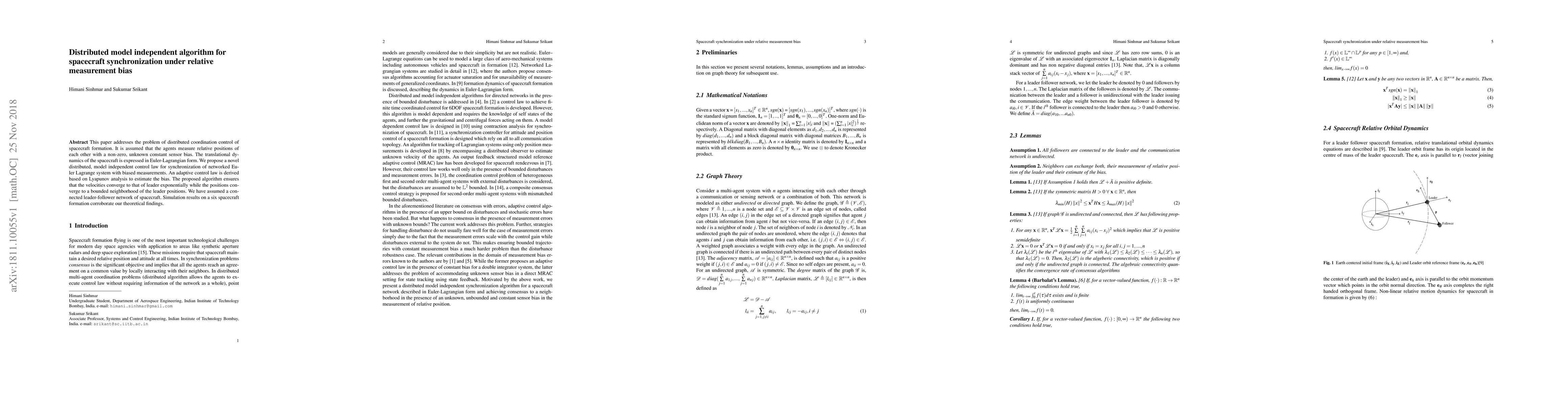This paper addresses the problem of distributed coordination control of spacecraft formation. It is assumed that the agents measure relative positions of each other with a non-zero, unknown constant sensor bias. The translational dynamics of the spacecraft is expressed in Euler-Lagrangian form. We propose a novel distributed, model independent control law for synchronization of networked Euler Lagrange system with biased measurements. An adaptive control law is derived based on Lyapunov analysis to estimate the bias. The proposed algorithm ensures that the velocities converge to that of leader exponentially while the positions converge to a bounded neighborhood of the leader positions. We have assumed a connected leader-follower network of spacecraft. Simulation results on a six spacecraft formation corroborate our theoretical findings.