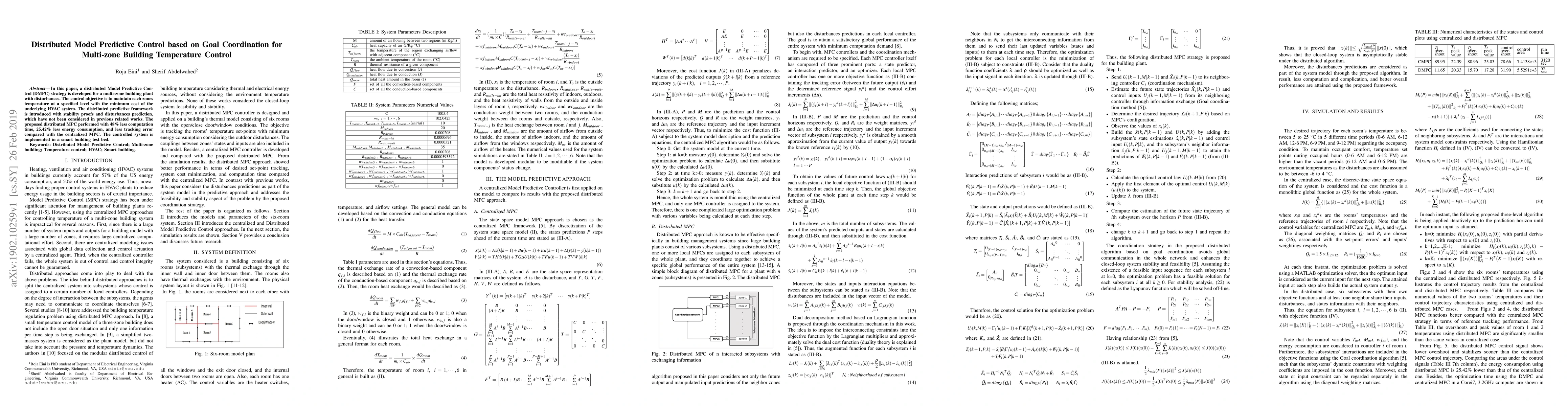 This paper proposes a distributed Model Predictive Control strategy for multi-zone building temperature control, achieving 48% less computation time and 25.42% less energy consumption compared to centralized MPC, while maintaining zone temperatures with minimal HVAC system cost. The framework includes stability proofs and disturbance prediction.