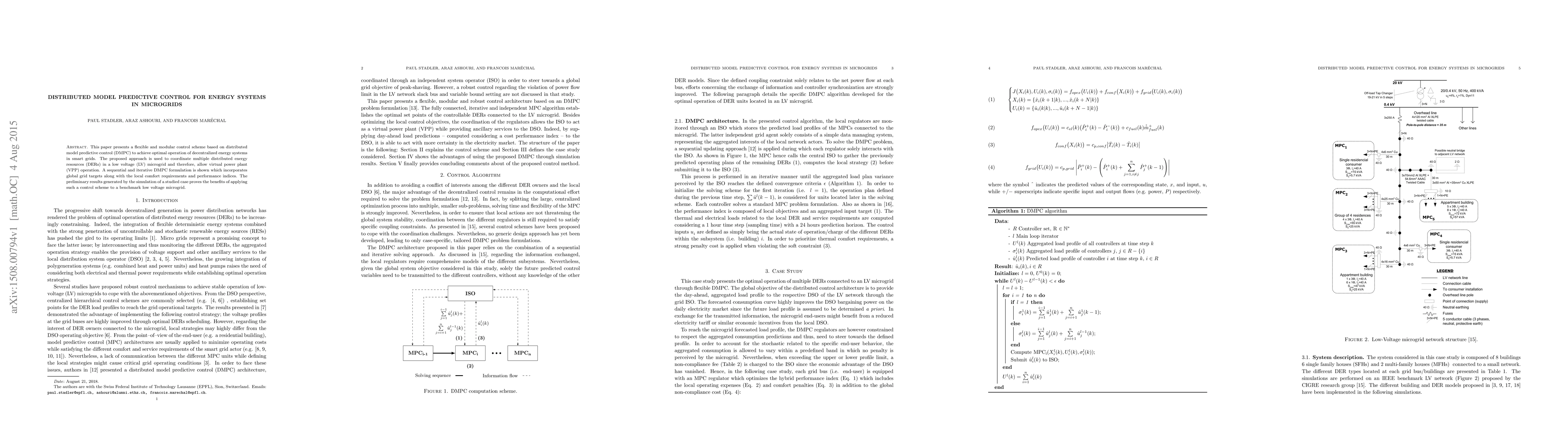 This paper proposes a distributed model predictive control (DMPC) scheme for optimal operation in microgrids, coordinating multiple distributed energy resources to enable virtual power plant operation. Simulation results demonstrate the benefits of this approach in achieving global grid targets and local comfort requirements.