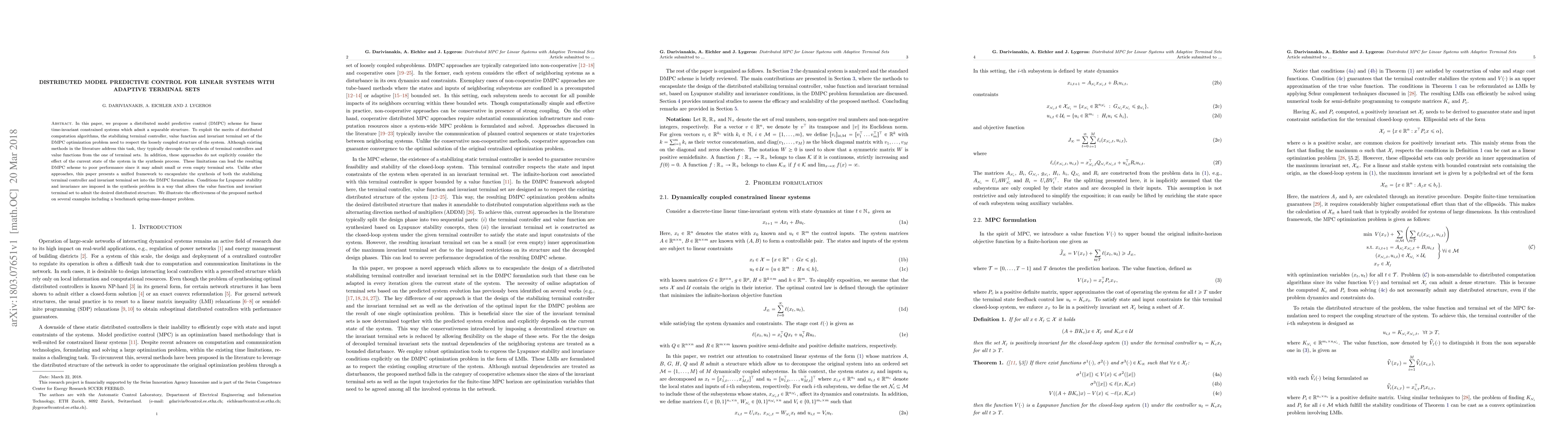 This paper proposes a distributed model predictive control scheme for linear systems with adaptive terminal sets, addressing limitations of existing methods by unifying the synthesis of controllers and terminal sets in a single formulation.