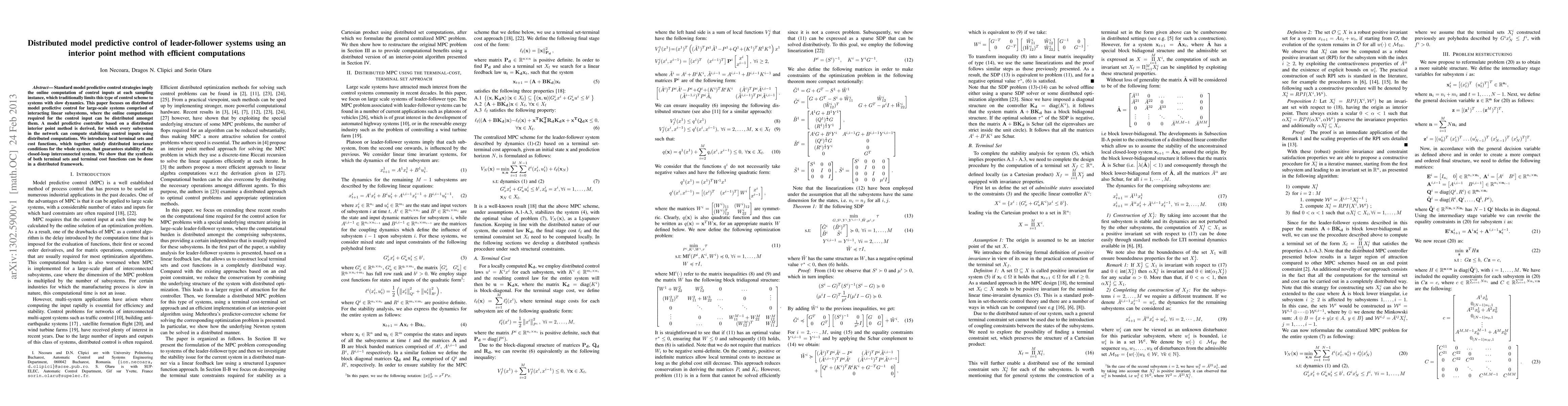 This paper proposes a distributed model predictive control strategy for large-scale systems using a distributed interior point method, enabling efficient computation of stabilizing control inputs across interacting subsystems. The approach ensures stability through distributed invariance conditions and local terminal sets.