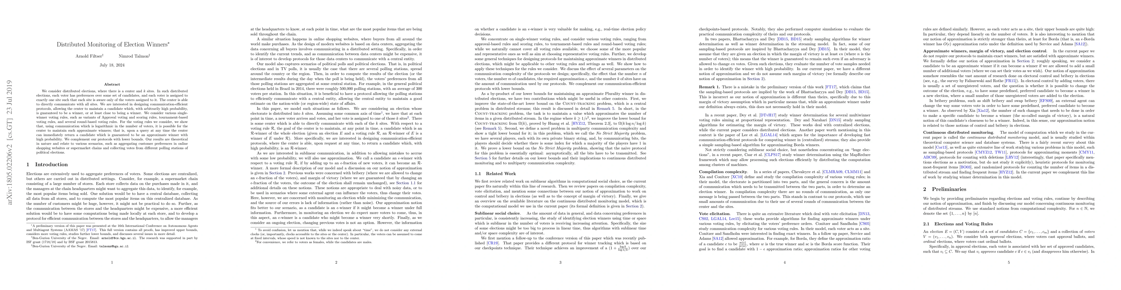 We consider distributed elections, where there is a center and $k$ sites. In such distributed elections, each voter has preferences over some set of candidates, and each voter is assigned to exactly one site such that each site is aware only of the voters assigned to it. The center is able to directly communicate with all sites. We are interested in designing communication-efficient protocols, allowing the center to maintain a candidate which, with arbitrarily high probability, is guaranteed to be a winner, or at least close to being a winner. We consider various single-winner voting rules, such as variants of Approval voting and scoring rules, tournament-based voting rules, and several round-based voting rules. For the voting rules we consider, we show that, using communication which is logarithmic in the number of voters, it is possible for the center to maintain such approximate winners; that is, upon a query at any time the center can immediately return a candidate which is guaranteed to be an approximate winner with high probability. We complement our protocols with lower bounds. Our results are theoretical in nature and relate to various scenarios, such as aggregating customer preferences in online shopping websites or supermarket chains and collecting votes from different polling stations of political elections.