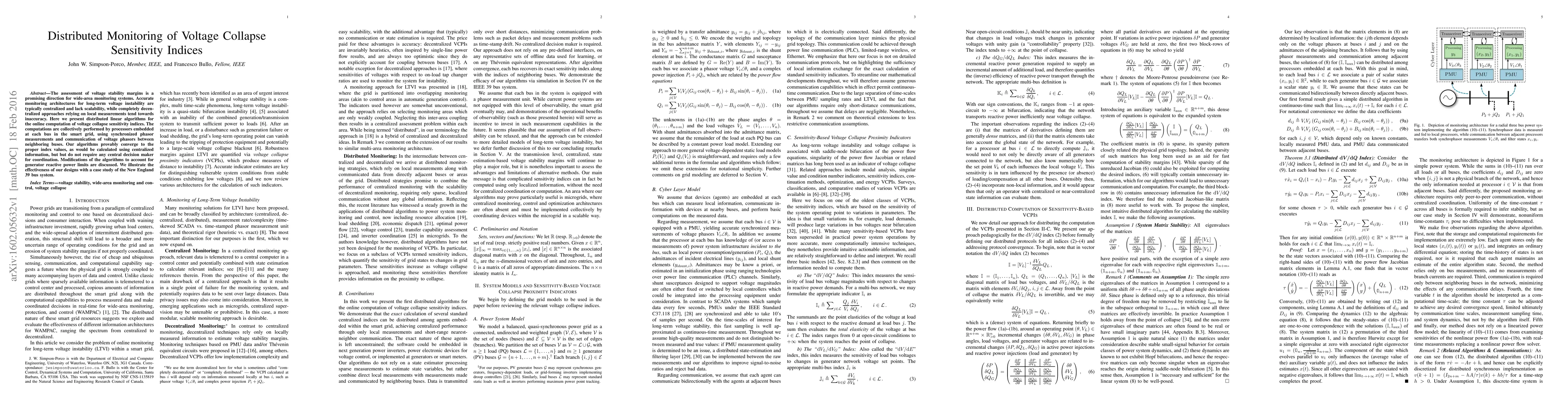 This paper proposes distributed linear algorithms for computing voltage collapse sensitivity indices in smart grids, enabling scalable and accurate online monitoring without centralized coordination. The algorithms converge to centralized index values using local measurements and communication between neighboring buses, and are demonstrated effective in the New England 39 bus system.