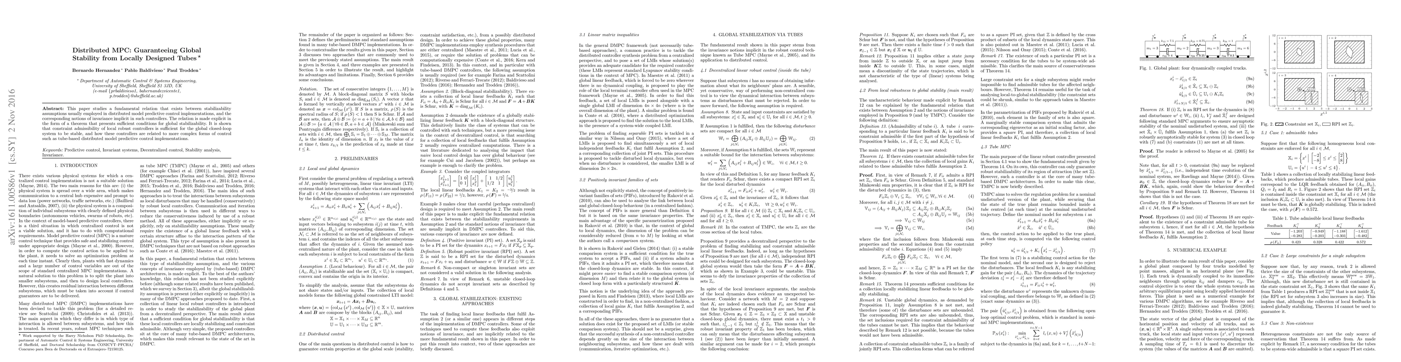 This paper studies a fundamental relation that exists between stabilizability assumptions usually employed in distributed model predictive control implementations, and the corresponding notions of invariance implicit in such controllers. The relation is made explicit in the form of a theorem that presents sufficient conditions for global stabilizability. It is shown that constraint admissibility of local robust controllers is sufficient for the global closed-loop system to be stable, and how these controllers are related to more complex forms of control such as tube-based distributed model predictive control implementations.