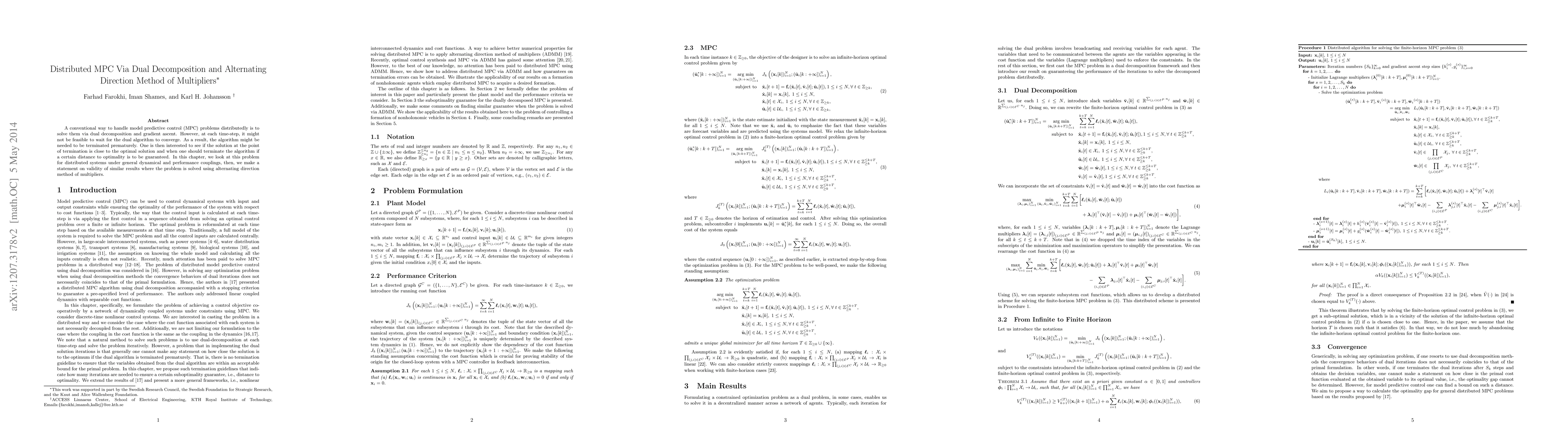 A conventional way to handle model predictive control (MPC) problems distributedly is to solve them via dual decomposition and gradient ascent. However, at each time-step, it might not be feasible to wait for the dual algorithm to converge. As a result, the algorithm might be needed to be terminated prematurely. One is then interested to see if the solution at the point of termination is close to the optimal solution and when one should terminate the algorithm if a certain distance to optimality is to be guaranteed. In this chapter, we look at this problem for distributed systems under general dynamical and performance couplings, then, we make a statement on validity of similar results where the problem is solved using alternating direction method of multipliers.