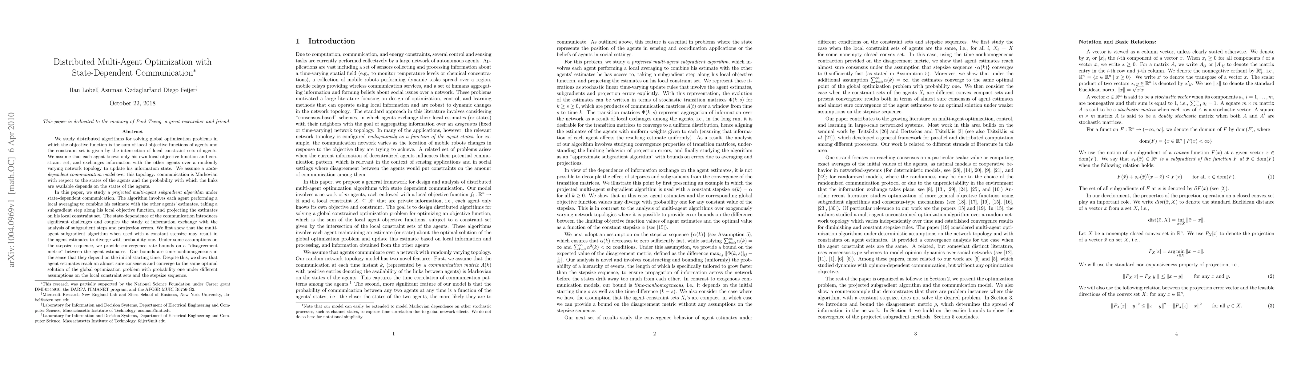 We study distributed algorithms for solving global optimization problems in which the objective function is the sum of local objective functions of agents and the constraint set is given by the intersection of local constraint sets of agents. We assume that each agent knows only his own local objective function and constraint set, and exchanges information with the other agents over a randomly varying network topology to update his information state. We assume a state-dependent communication model over this topology: communication is Markovian with respect to the states of the agents and the probability with which the links are available depends on the states of the agents. In this paper, we study a projected multi-agent subgradient algorithm under state-dependent communication. The algorithm involves each agent performing a local averaging to combine his estimate with the other agents' estimates, taking a subgradient step along his local objective function, and projecting the estimates on his local constraint set. The state-dependence of the communication introduces significant challenges and couples the study of information exchange with the analysis of subgradient steps and projection errors. We first show that the multi-agent subgradient algorithm when used with a constant stepsize may result in the agent estimates to diverge with probability one. Under some assumptions on the stepsize sequence, we provide convergence rate bounds on a "disagreement metric" between the agent estimates. Our bounds are time-nonhomogeneous in the sense that they depend on the initial starting time. Despite this, we show that agent estimates reach an almost sure consensus and converge to the same optimal solution of the global optimization problem with probability one under different assumptions on the local constraint sets and the stepsize sequence.