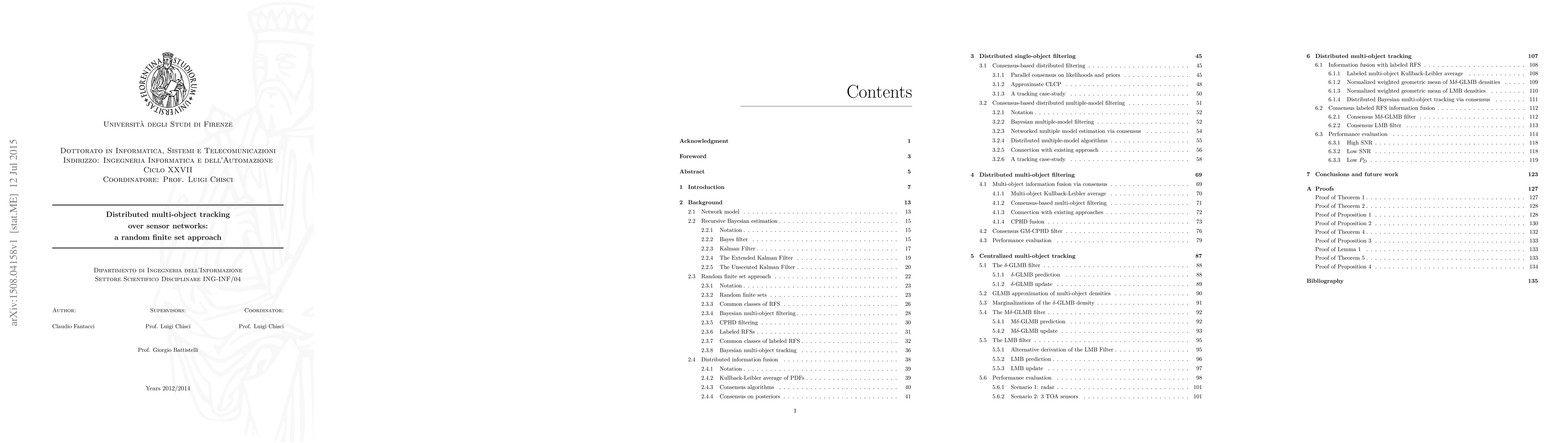 The aim of the present dissertation is to address distributed tracking over a network of heterogeneous and geographically dispersed nodes (or agents) with sensing, communication and processing capabilities. Tracking is carried out in the Bayesian framework and its extension to a distributed context is made possible via an information-theoretic approach to data fusion which exploits consensus algorithms and the notion of Kullback-Leibler Average (KLA) of the Probability Density Functions (PDFs) to be fused. The first step toward distributed tracking considers a single moving object. Consensus takes place in each agent for spreading information over the network so that each node can track the object. To achieve such a goal, consensus is carried out on the local single-object posterior distribution, which is the result of local data processing, in the Bayesian setting, exploiting the last available measurement about the object. The next step is in the direction of distributed estimation of multiple moving objects. In order to model, in a rigorous and elegant way, a possibly time-varying number of objects present in a given area of interest, the Random Finite Set (RFS) formulation is adopted since it provides the notion of probability density for multi-object states that allows to directly extend existing tools in distributed estimation to multi-object tracking. The last theoretical step of the present dissertation is toward distributed filtering with the further requirement of unique object identities. To this end the labeled RFS framework is adopted as it provides a tractable approach to the multi-object Bayesian recursion. A generalization of the KLA to the labeled RFS framework, enables the development of novel consensus multi-object tracking filters which are fully distributed, scalable and computationally efficient.
