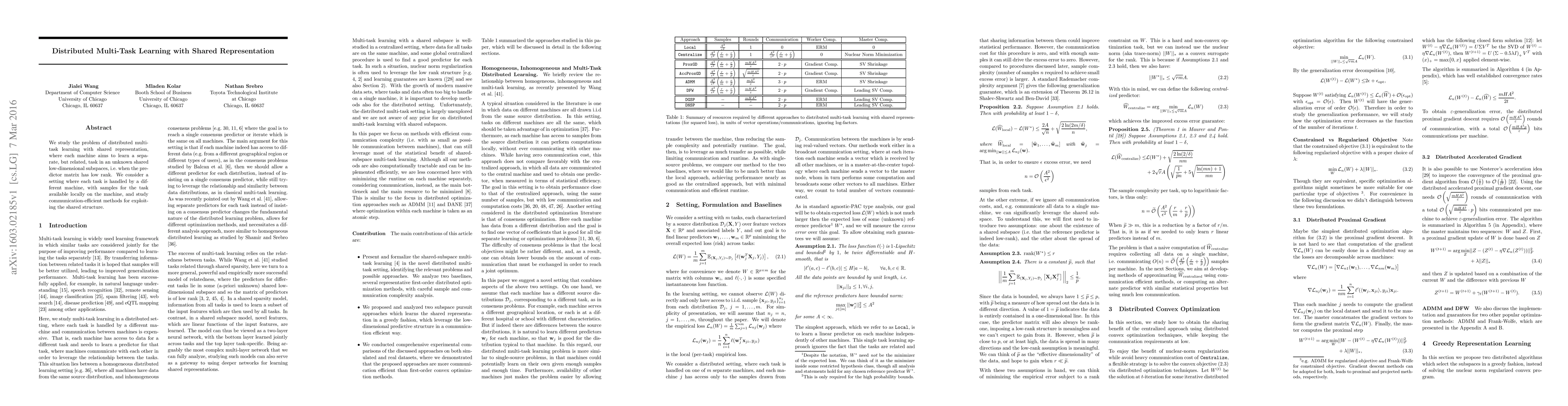 This paper investigates distributed multi-task learning in a setting where multiple machines learn related tasks from local data, aiming to exploit shared low-rank representations. It proposes communication-efficient methods to leverage the shared structure across tasks.