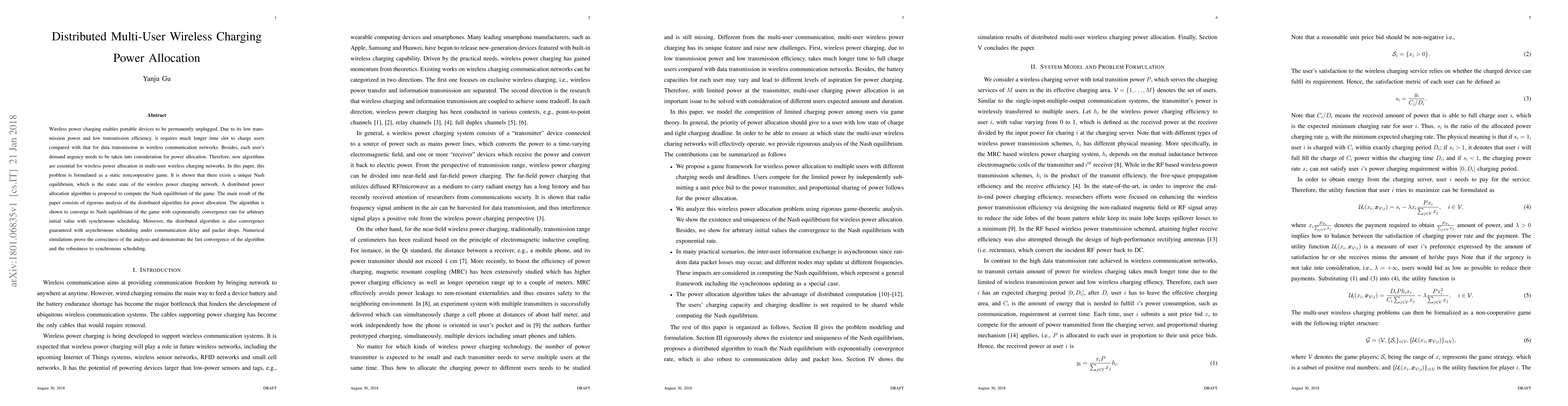 Wireless power charging enables portable devices to be permanently unplugged. Due to its low transmission power and low transmission efficiency, it requires much longer time slot to charge users compared with that for data transmission in wireless communication networks. Besides, each user's demand urgency needs to be taken into consideration for power allocation. Therefore, new algorithms are essential for wireless power allocation in multi-user wireless charging networks. In this paper, this problem is formulated as a static noncooperative game. It is shown that there exists a unique Nash equilibrium, which is the static state of the wireless power charging network. A distributed power allocation algorithm is proposed to compute the Nash equilibrium of the game. The main result of the paper consists of rigorous analysis of the distributed algorithm for power allocation. The algorithm is shown to converge to Nash equilibrium of the game with exponentially convergence rate for arbitrary initial value with synchronous scheduling. Moreover, the distributed algorithm is also convergence guaranteed with asynchronous scheduling under communication delay and packet drops. Numerical simulations prove the correctness of the analysis and demonstrate the fast convergence of the algorithm and the robustness to synchronous scheduling.