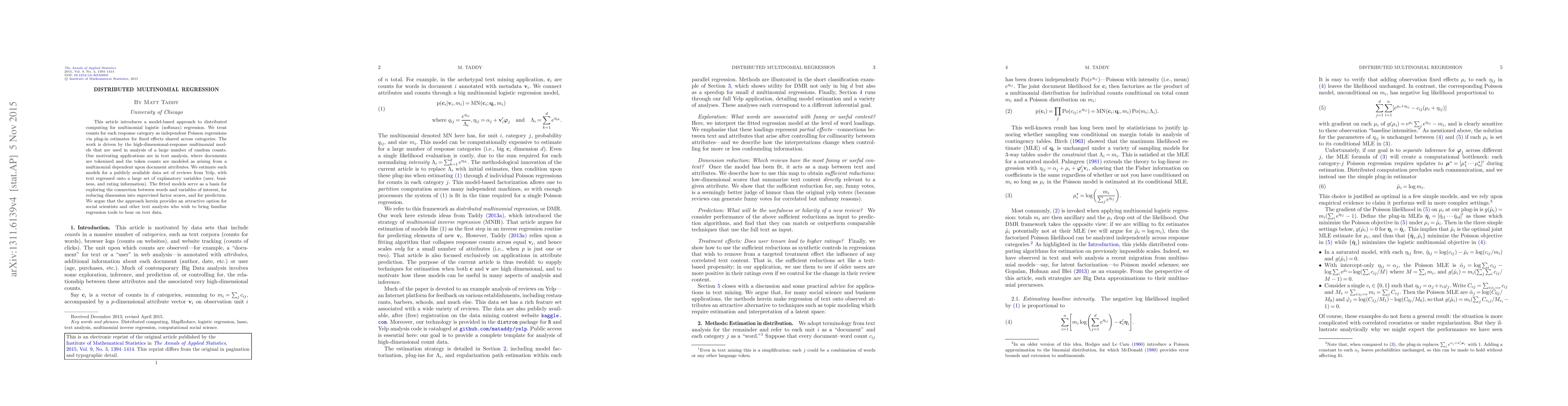 This paper proposes a distributed computing model for multinomial regression using independent Poisson regressions for each response category. The approach is demonstrated on a Yelp review dataset, showing its utility for text analysis and prediction in social sciences.