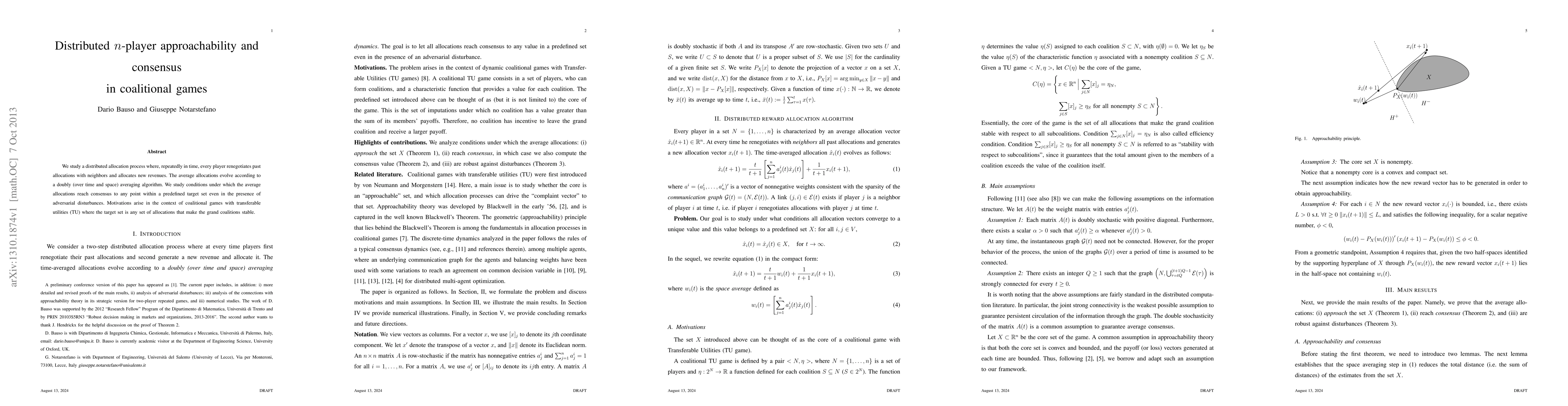 We study a distributed allocation process where, repeatedly in time, every player renegotiates past allocations with neighbors and allocates new revenues. The average allocations evolve according to a doubly (over time and space) averaging algorithm. We study conditions under which the average allocations reach consensus to any point within a predefined target set even in the presence of adversarial disturbances. Motivations arise in the context of coalitional games with transferable utilities (TU) where the target set is any set of allocations that make the grand coalitions stable.