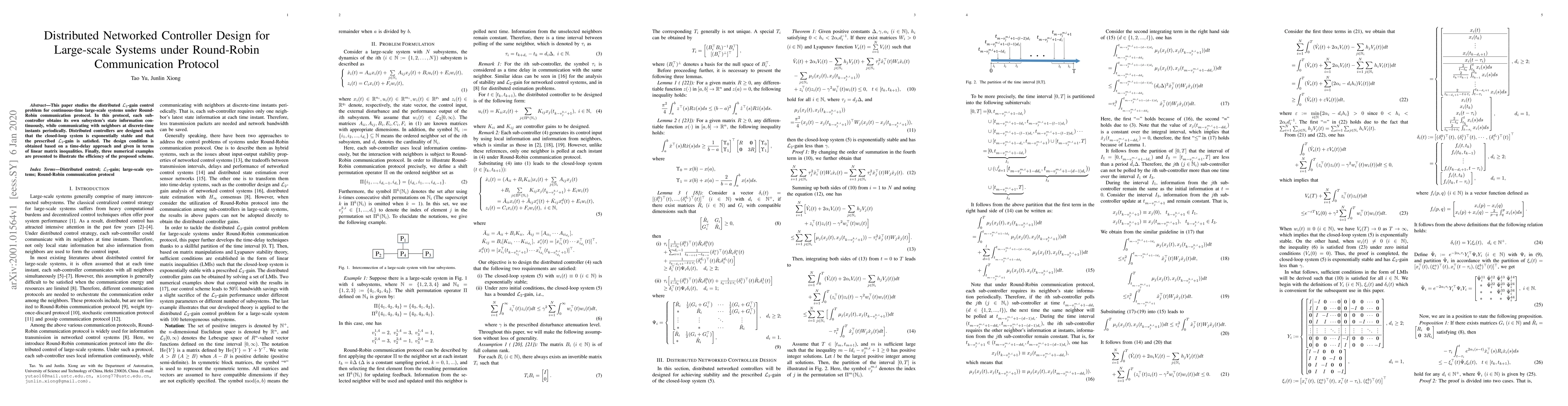 This paper proposes a distributed networked controller design for large-scale systems under a Round-Robin communication protocol, ensuring exponential stability and prescribed L2-gain. The design conditions are formulated using linear matrix inequalities and validated through numerical examples.