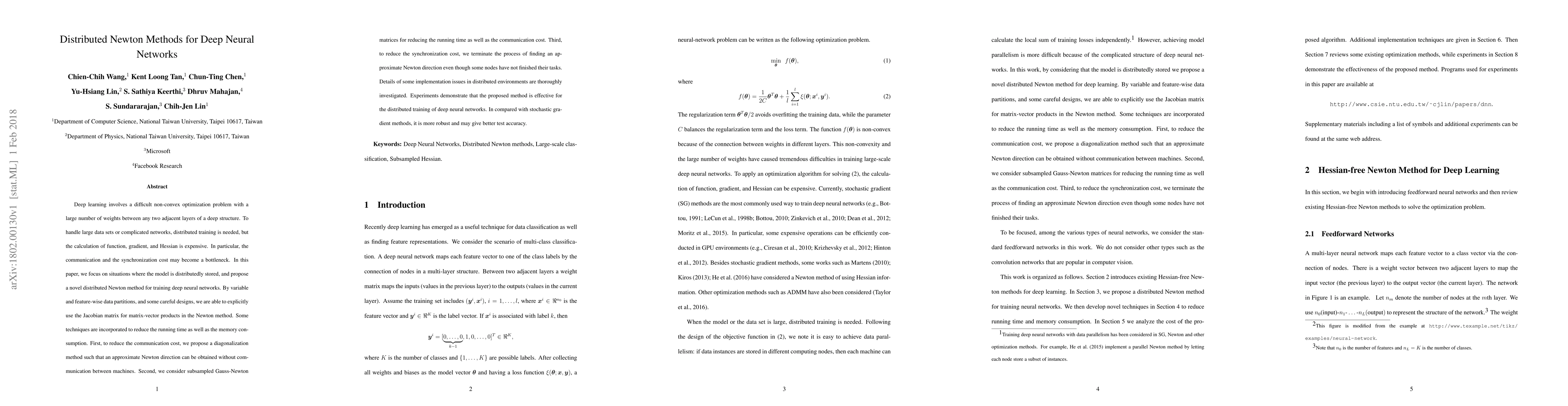 This paper proposes a novel distributed Newton method for training deep neural networks, addressing the high computational and communication costs associated with large datasets and complex networks. The method employs diagonalization and subsampled Gauss-Newton matrices to reduce running time and communication, while experiments show improved robustness and potentially better accuracy compared to stochastic gradient methods.