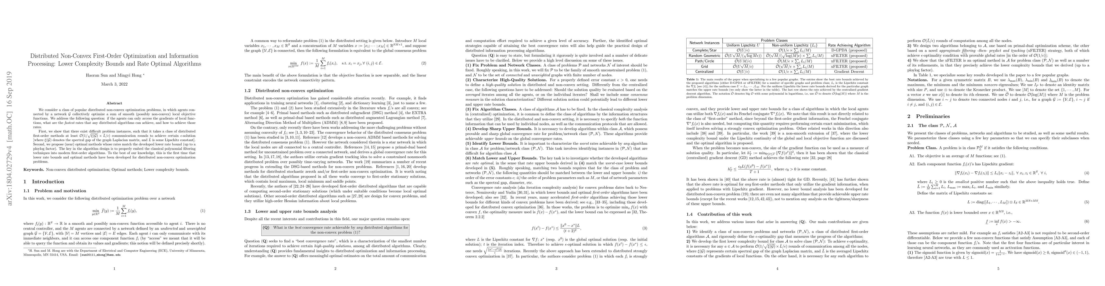 We consider a class of popular distributed non-convex optimization problems, in which agents connected by a network $\mathcal{G}$ collectively optimize a sum of smooth (possibly non-convex) local objective functions. We address the following question: if the agents can only access the gradients of local functions, what are the fastest rates that any distributed algorithms can achieve, and how to achieve those rates. First, we show that there exist difficult problem instances, such that it takes a class of distributed first-order methods at least $\mathcal{O}(1/\sqrt{\xi(\mathcal{G})} \times \bar{L} /{\epsilon})$ communication rounds to achieve certain $\epsilon$-solution [where $\xi(\mathcal{G})$ denotes the spectral gap of the graph Laplacian matrix, and $\bar{L}$ is some Lipschitz constant]. Second, we propose (near) optimal methods whose rates match the developed lower rate bound (up to a polylog factor). The key in the algorithm design is to properly embed the classical polynomial filtering techniques into modern first-order algorithms. To the best of our knowledge, this is the first time that lower rate bounds and optimal methods have been developed for distributed non-convex optimization problems.