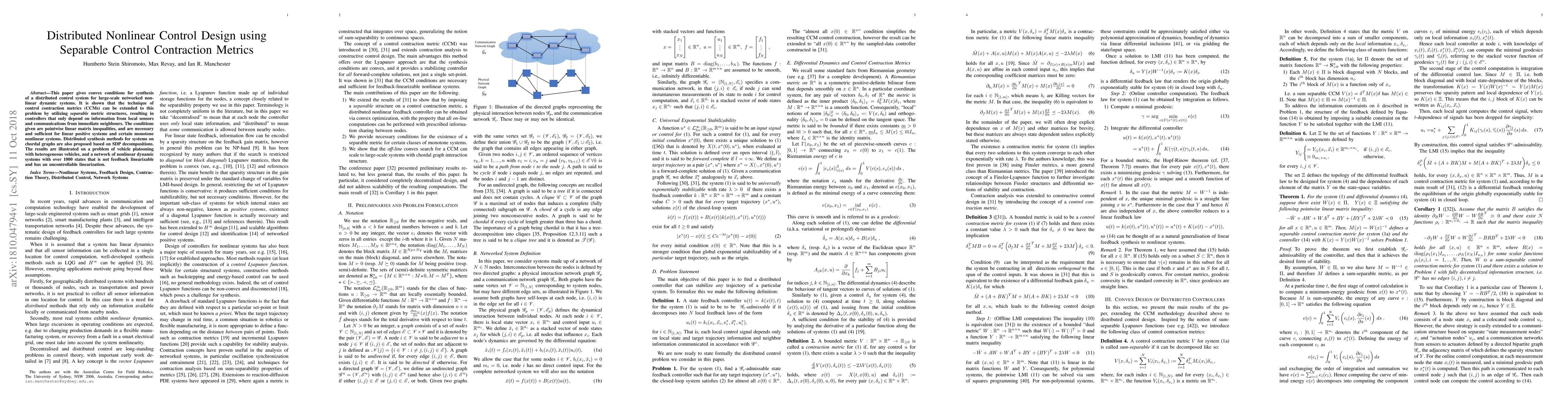This paper gives convex conditions for synthesis of a distributed control system for large-scale networked nonlinear dynamic systems. It is shown that the technique of control contraction metrics (CCMs) can be extended to this problem by utilizing separable metric structures, resulting in controllers that only depend on information from local sensors and communications from immediate neighbours. The conditions given are pointwise linear matrix inequalities, and are necessary and sufficient for linear positive systems and certain monotone nonlinear systems. Distributed synthesis methods for systems on chordal graphs are also proposed based on SDP decompositions. The results are illustrated on a problem of vehicle platooning with heterogeneous vehicles, and a network of nonlinear dynamic systems with over 1000 states that is not feedback linearizable and has an uncontrollable linearization