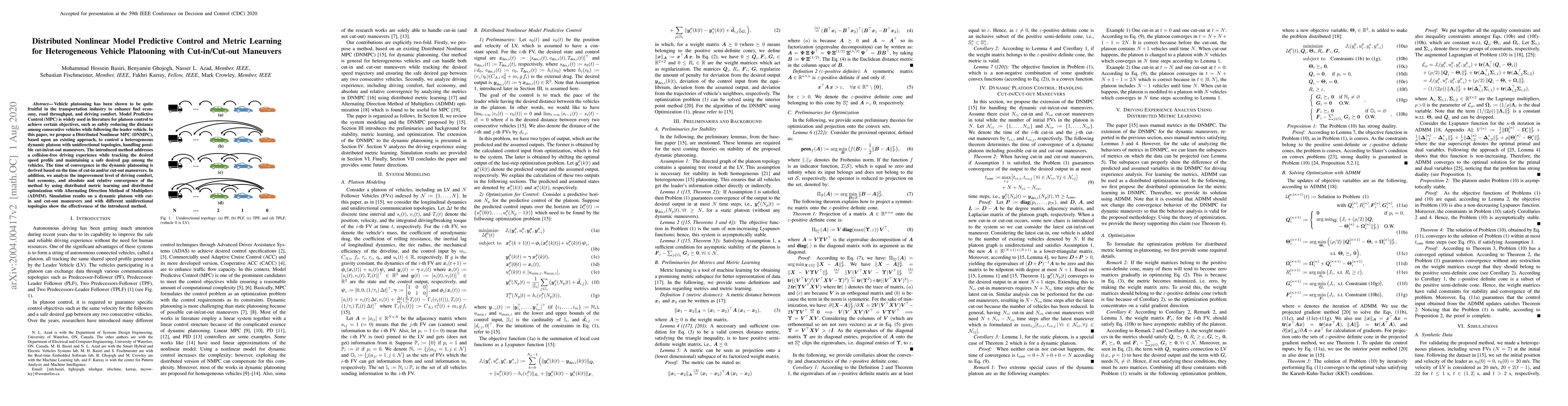 This paper proposes a Distributed Nonlinear Model Predictive Control (DNMPC) approach for controlling heterogeneous vehicle platoons, addressing cut-in/cut-out maneuvers while ensuring collision-free driving and maintaining safe gaps. The method employs distributed metric learning and optimization via ADMM to enhance driving comfort and fuel economy.