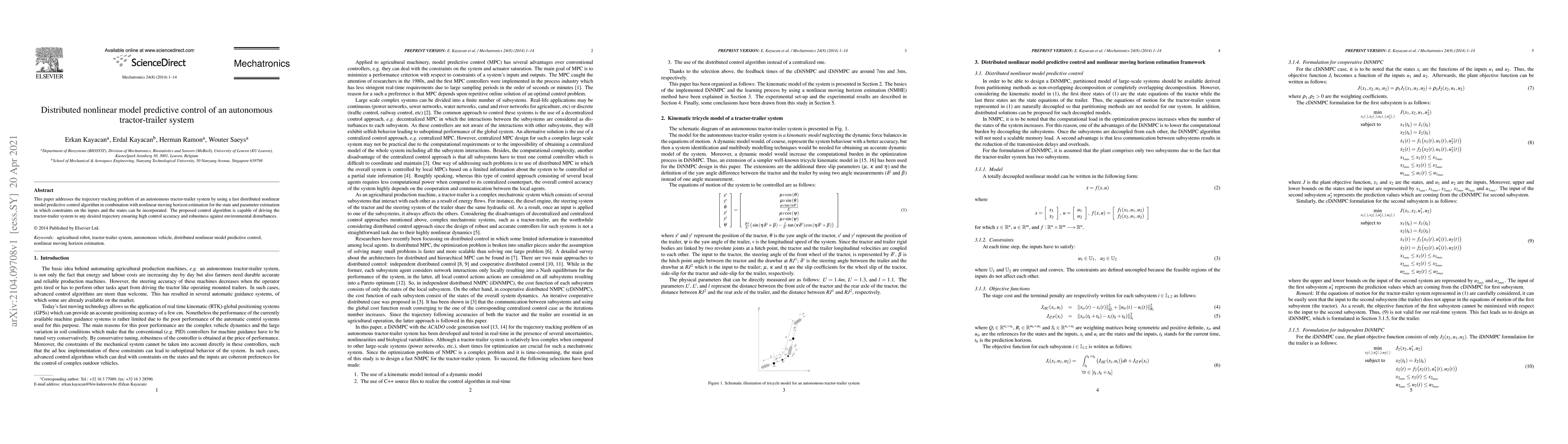 This research employs a fast distributed nonlinear model predictive control (DiNMPC) algorithm combined with nonlinear moving horizon estimation (NMHE) for state and parameter estimation in an autonomous tractor-trailer system, incorporating constraints on inputs and states.