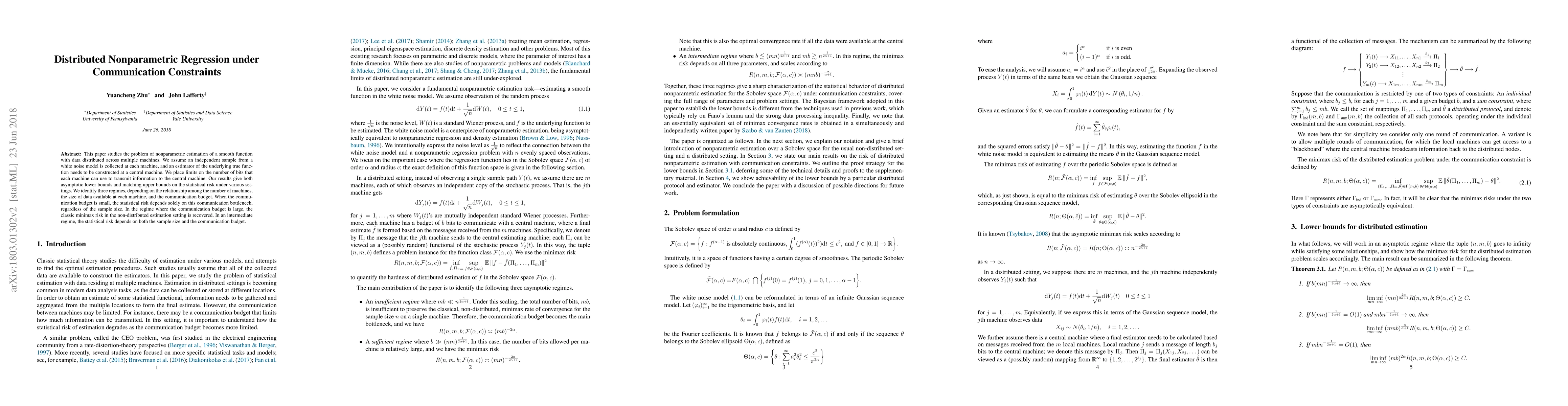 This paper investigates nonparametric regression across multiple machines with communication constraints, providing both lower and upper bounds on statistical risk. It identifies three regimes based on the interplay between the number of machines, data size, and communication budget, showing that risk behavior varies significantly under different communication constraints.
