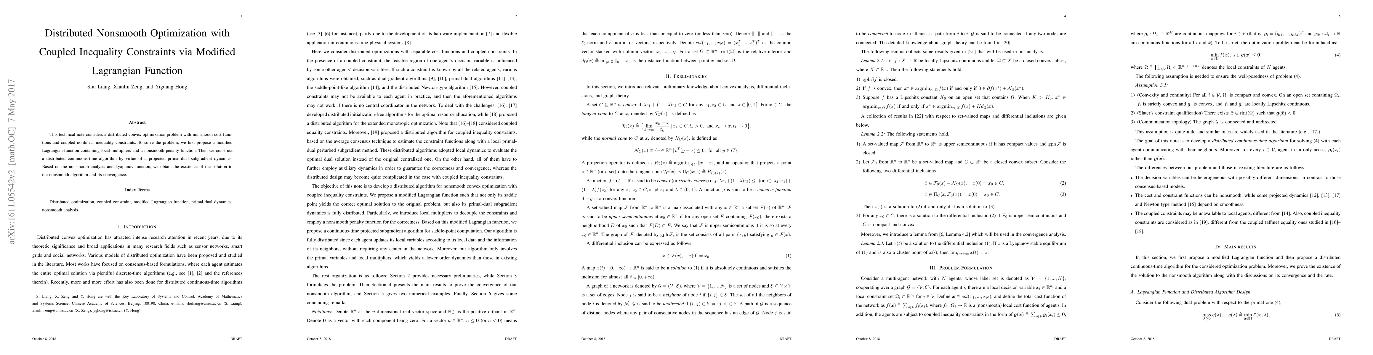 This paper proposes a modified Lagrangian function to tackle distributed convex optimization with nonsmooth cost functions and coupled inequality constraints. It introduces a distributed continuous-time algorithm based on projected primal-dual subgradient dynamics, proving the existence and convergence of the solution using nonsmooth analysis and Lyapunov functions.