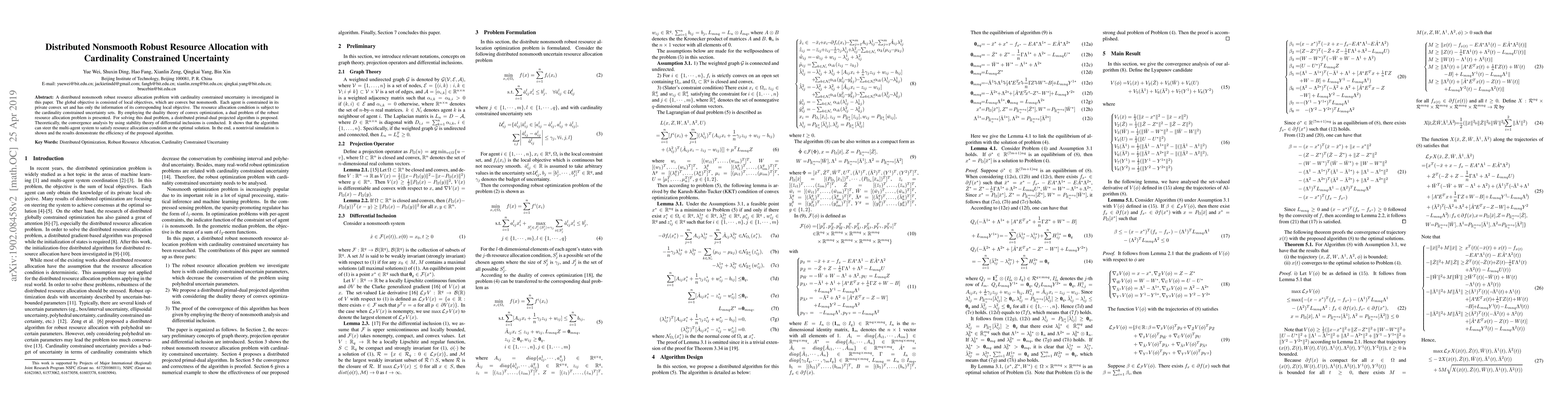 This paper investigates a distributed nonsmooth robust resource allocation problem with cardinality constrained uncertainty, proposing a dual problem and a distributed primal-dual projected algorithm. The algorithm is shown to converge to an optimal solution satisfying resource allocation conditions, as demonstrated through theoretical analysis and simulation.