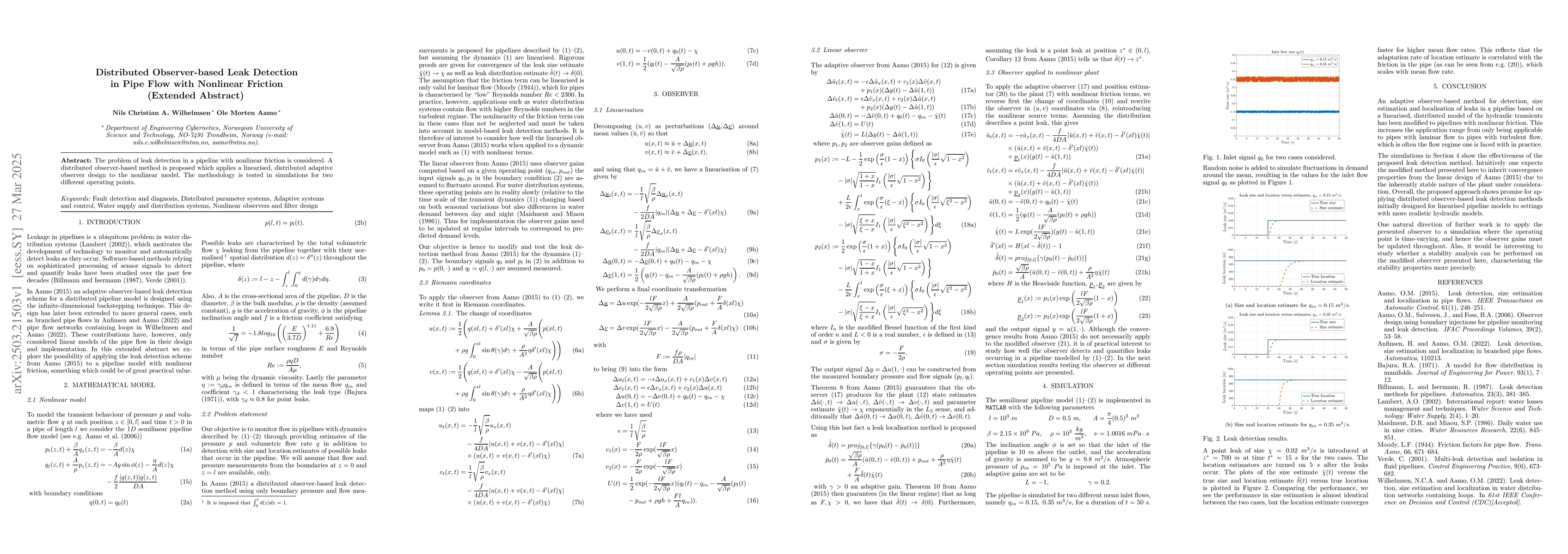 The paper proposes a distributed observer-based leak detection method for pipelines with nonlinear friction, using a linearized, distributed adaptive observer design applied to a nonlinear model. The methodology is tested in simulations for two different operating points.