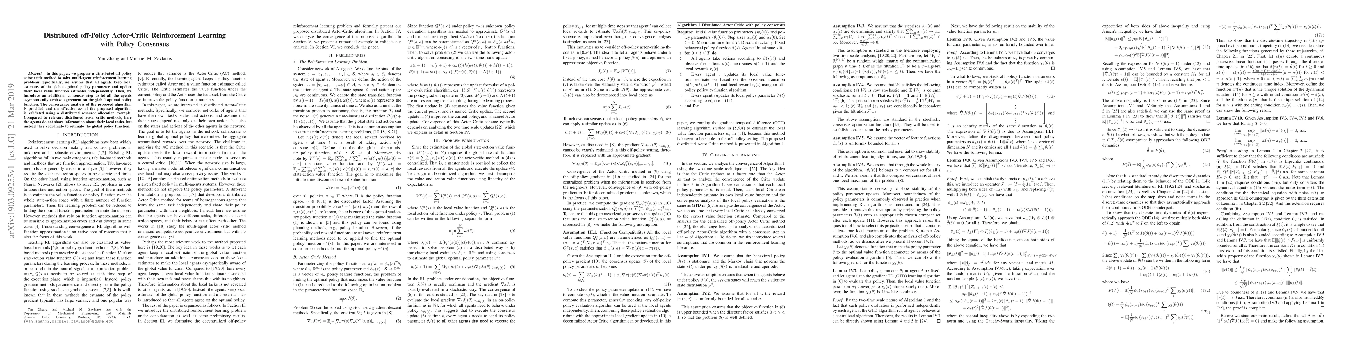 This paper presents a distributed off-policy actor-critic reinforcement learning method for multi-agent systems, where agents independently update local value functions and a consensus step ensures agreement on the global optimal policy. The method's convergence is analyzed, and its effectiveness is demonstrated through a distributed resource allocation example.