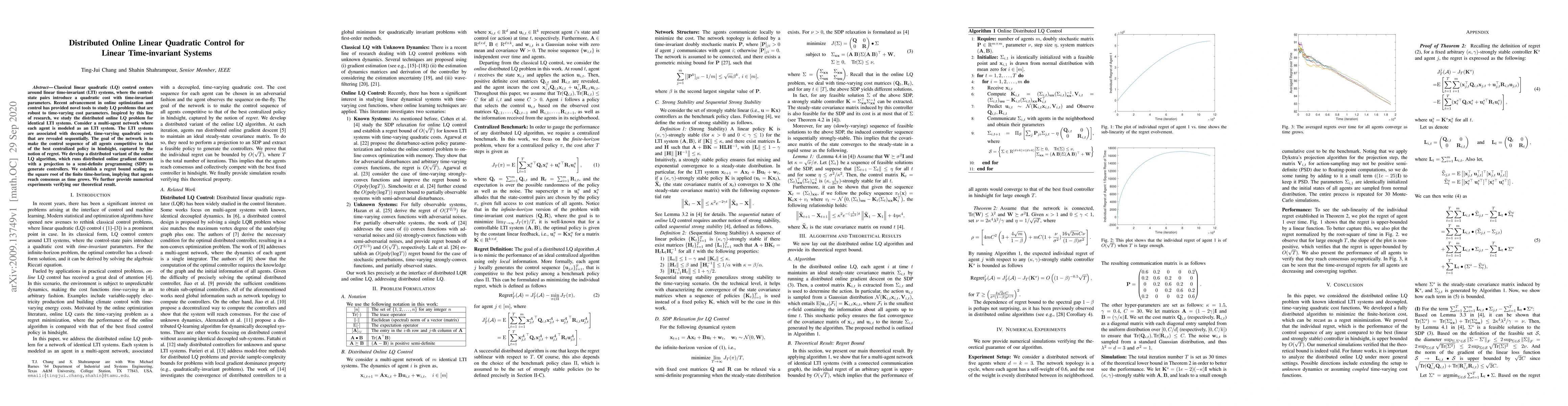 Classical linear quadratic (LQ) control centers around linear time-invariant (LTI) systems, where the control-state pairs introduce a quadratic cost with time-invariant parameters. Recent advancement in online optimization and control has provided novel tools to study LQ problems that are robust to time-varying cost parameters. Inspired by this line of research, we study the distributed online LQ problem for identical LTI systems. Consider a multi-agent network where each agent is modeled as an LTI system. The LTI systems are associated with decoupled, time-varying quadratic costs that are revealed sequentially. The goal of the network is to make the control sequence of all agents competitive to that of the best centralized policy in hindsight, captured by the notion of regret. We develop a distributed variant of the online LQ algorithm, which runs distributed online gradient descent with a projection to a semi-definite programming (SDP) to generate controllers. We establish a regret bound scaling as the square root of the finite time-horizon, implying that agents reach consensus as time grows. We further provide numerical experiments verifying our theoretical result.