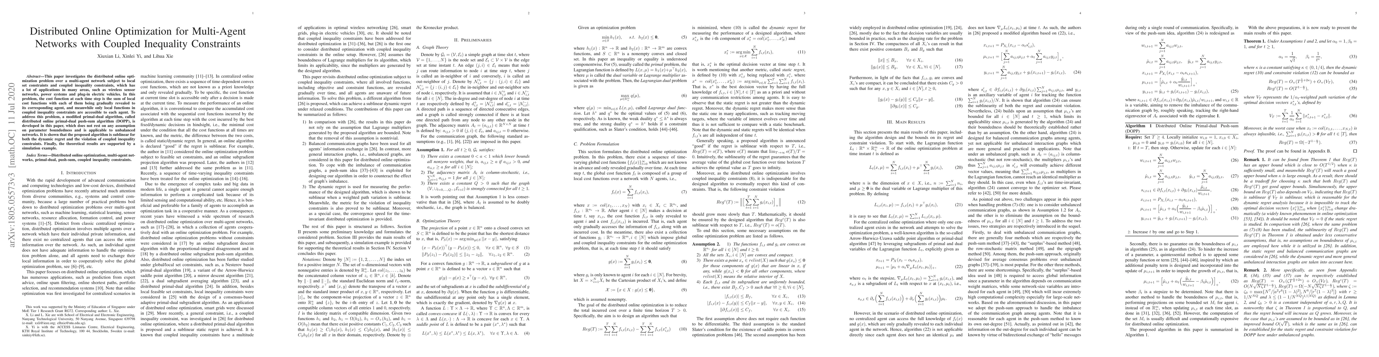 This paper develops a distributed online primal-dual push-sum algorithm (DOPP) to solve optimization problems in multi-agent networks with local and coupled inequality constraints. The proposed method achieves sublinear regret and constraint violation, applicable to unbalanced networks without parameter boundedness assumptions.